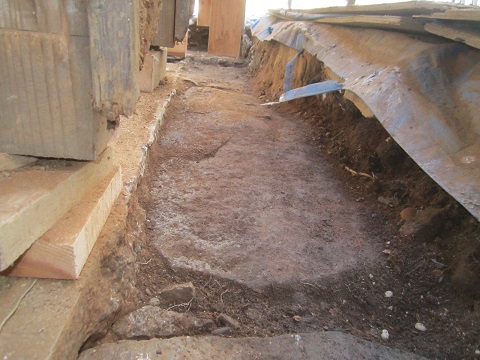 外部の腐食した柱の下にはこうした頑丈な楚石があるので、これらは利用して土台を入れ込み腐食柱は継ぎ直しをしながら取り替えることになりますので、柱が2重に立つ丈夫な構造になります。問題は腐食の原因の雨水の浸水なので、外周部に側溝を置いて対策を取る予定です。