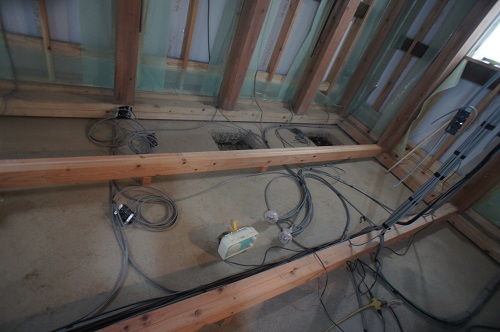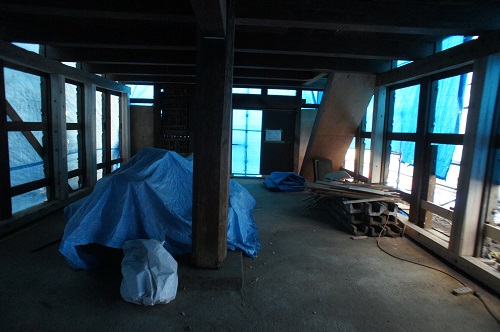蔵の構造補強は外周部の補強柱が大方取り付いて、かなり下がっていた2階床の水平レベルも直りました。