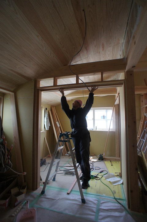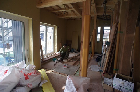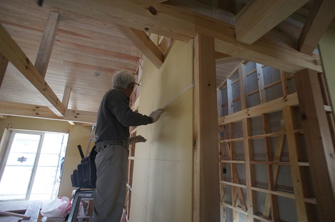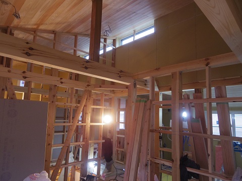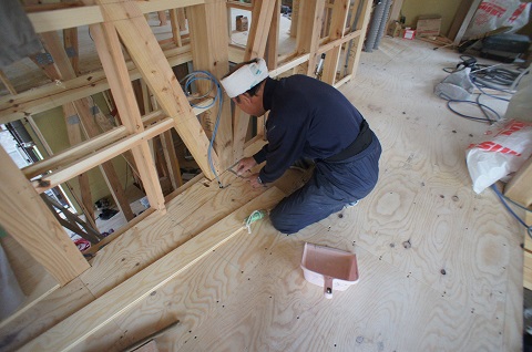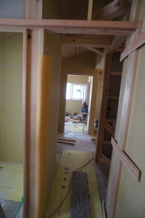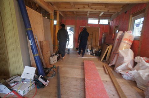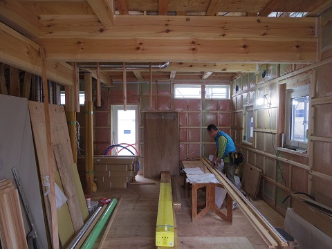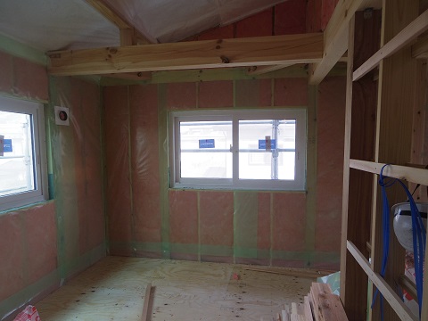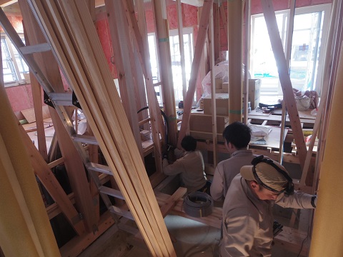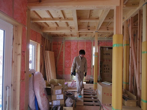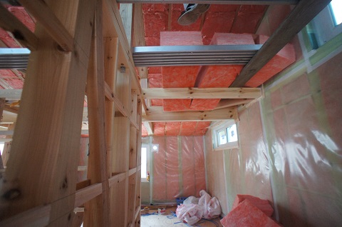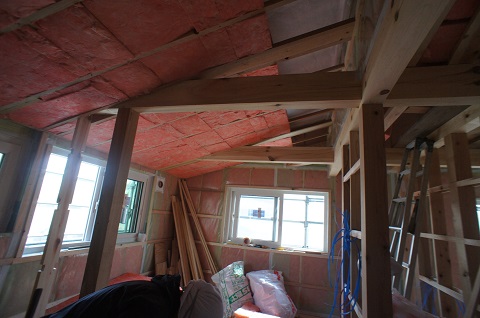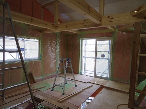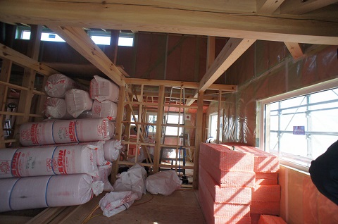 断熱工事が進む新築工事です。壁200mm屋根400mmの断熱です。