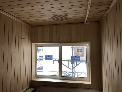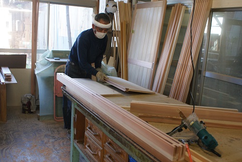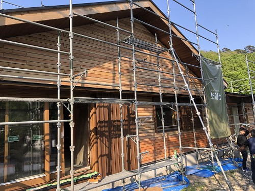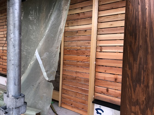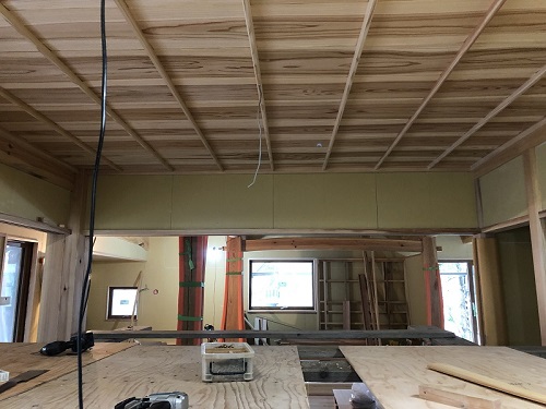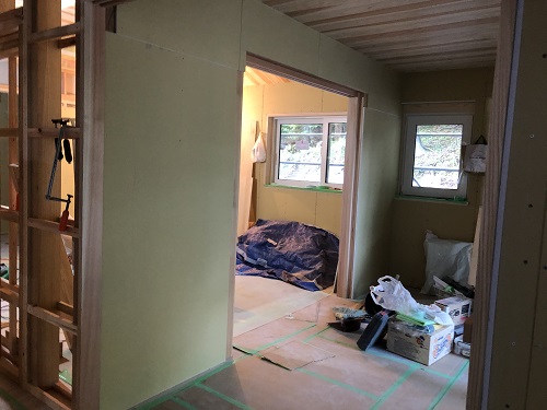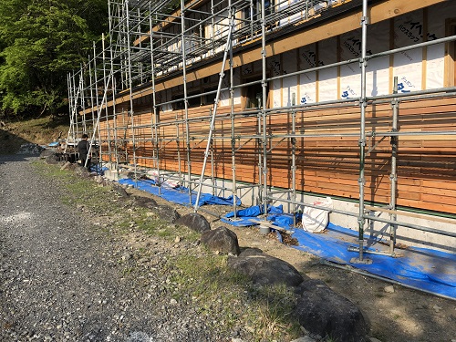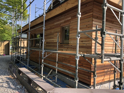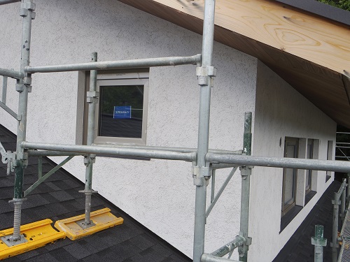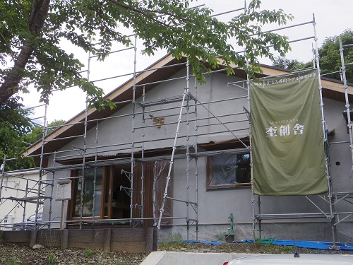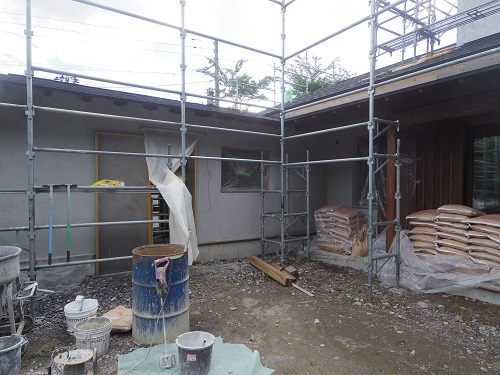 釜石の新築工事は、浴室のヒバ板張り込みが完了して、外部左官工事も進みました。