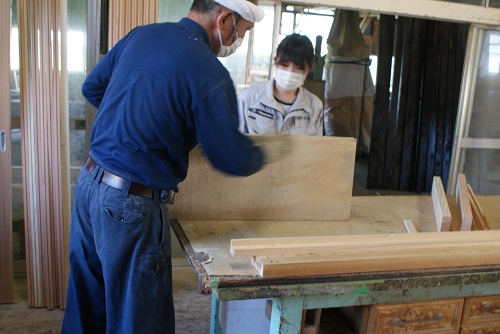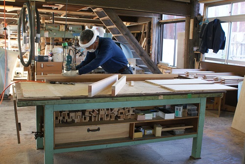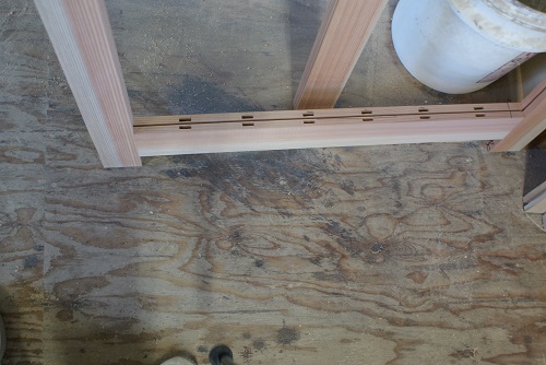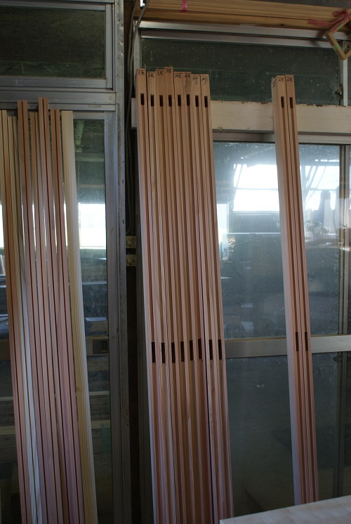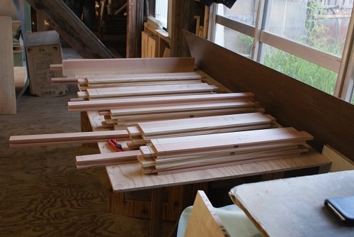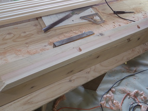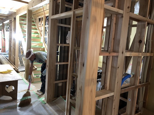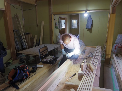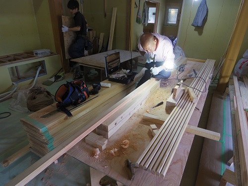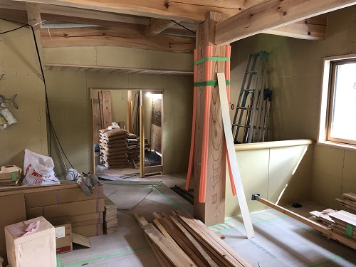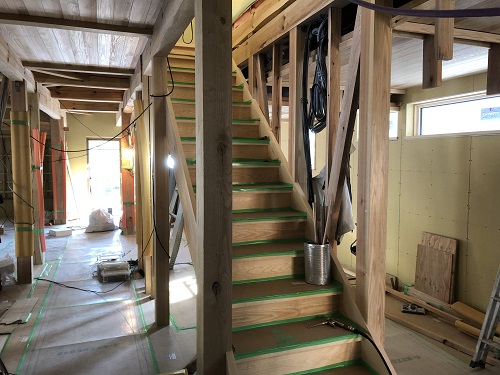 先週は、若手が頑張って外部の左官壁下地のザラ板張りを頑張り、内部では床張りと階段んの取り付けが進みました。