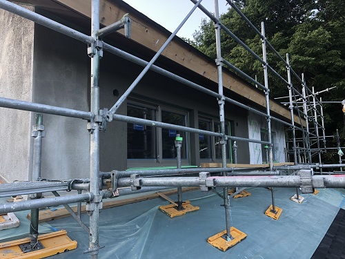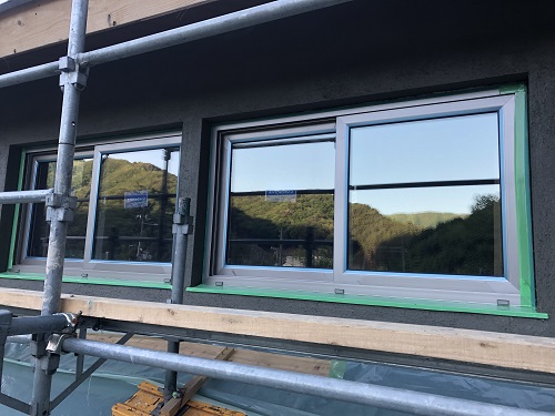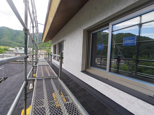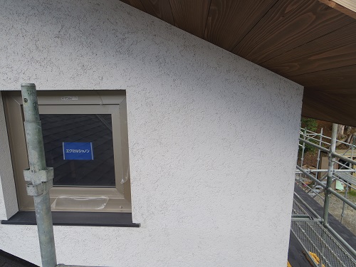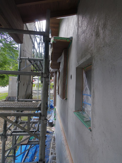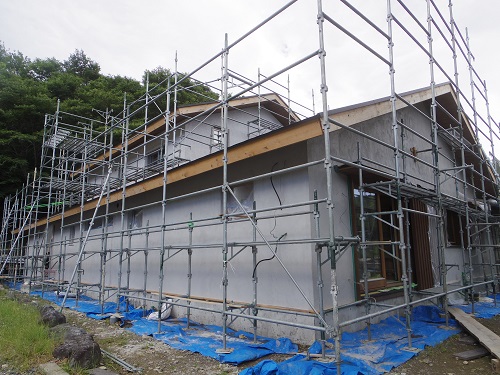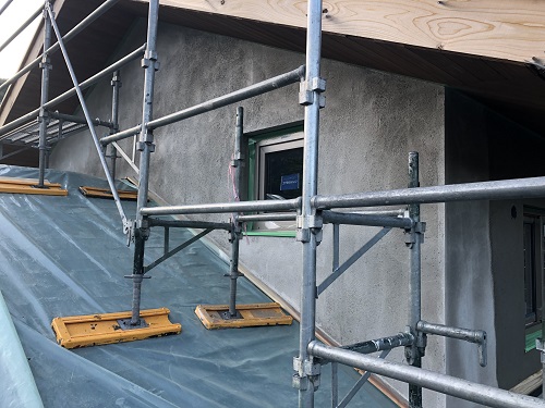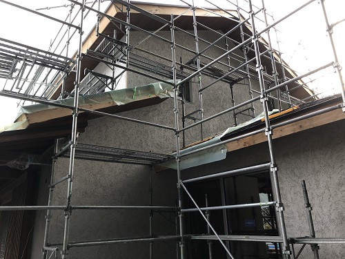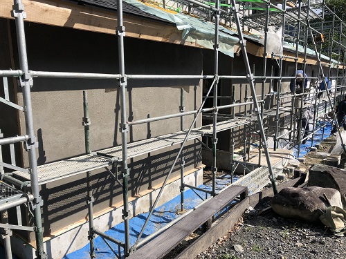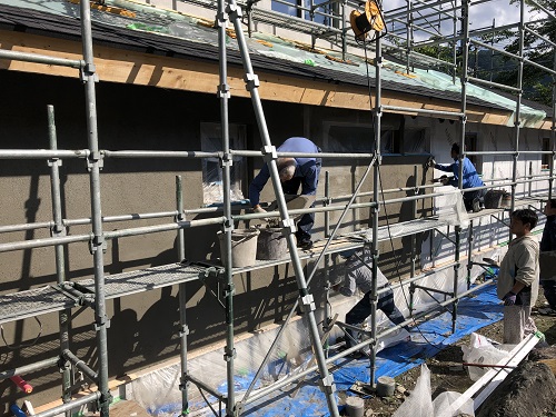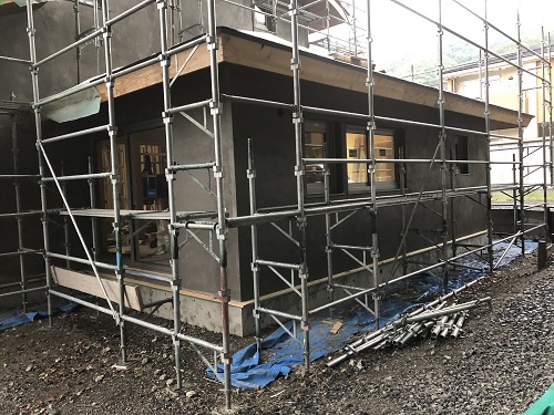 釜石の新築工事では外壁の左官壁の下塗りモルタルが塗り込まれています。