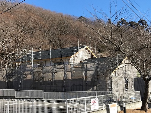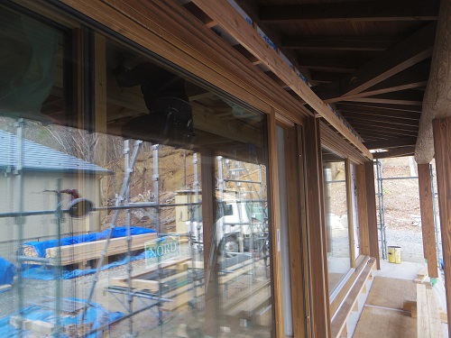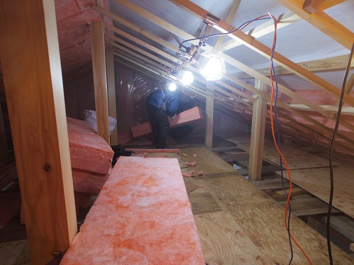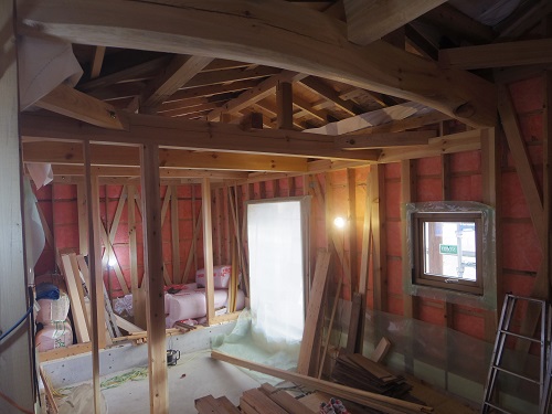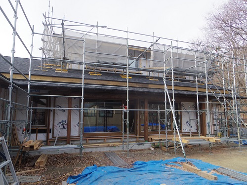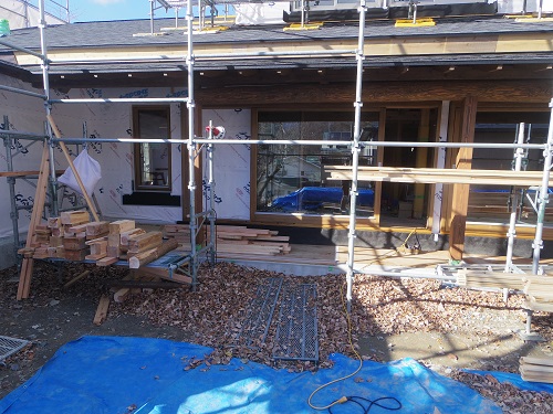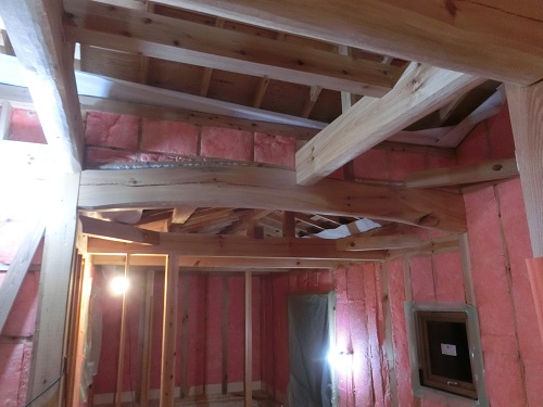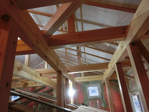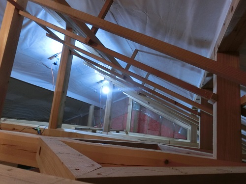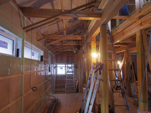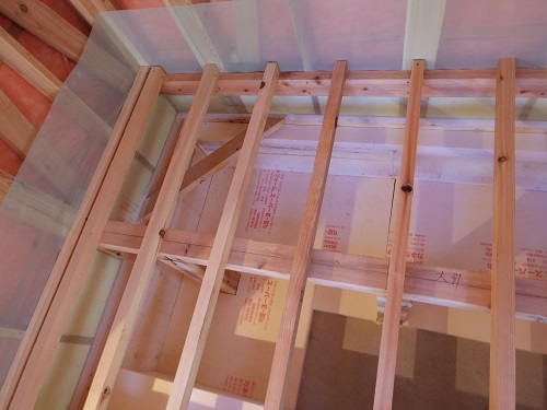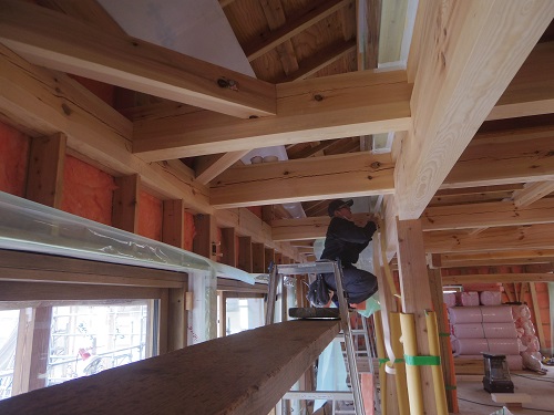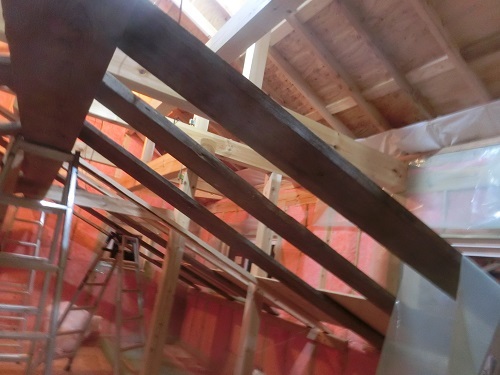 釜石の新築工事は、屋根断熱工事の下地組が進んで屋根断熱の段取りが進みました。