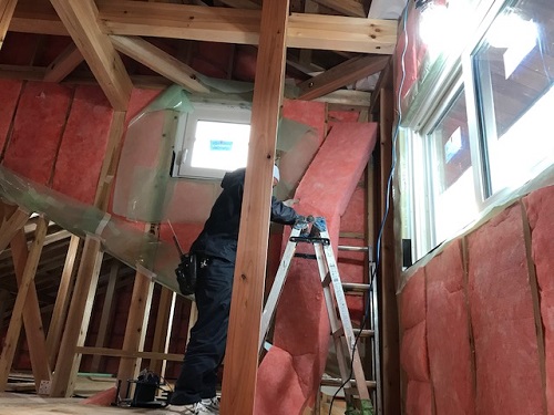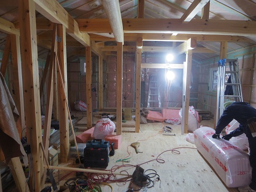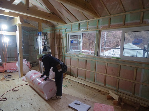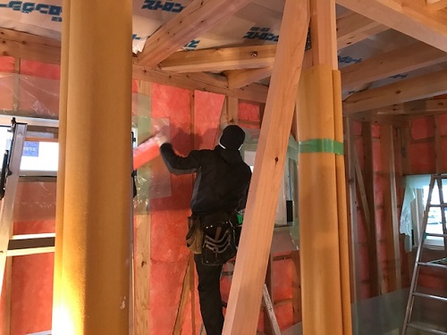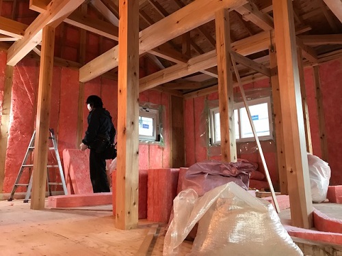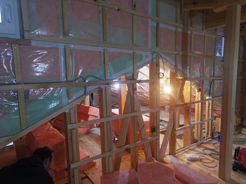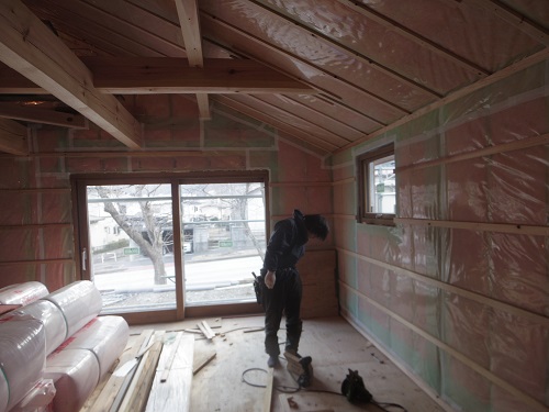 釜石の新築工事は、内断熱工事が進み壁200mm断熱が出来てきました。