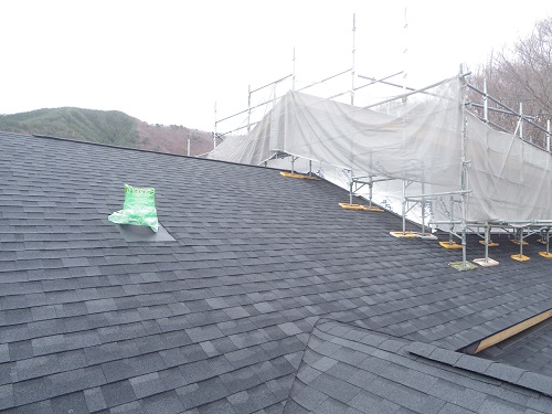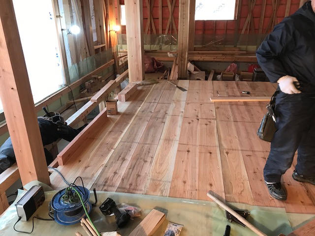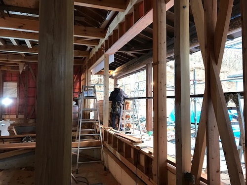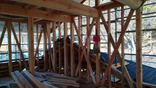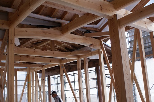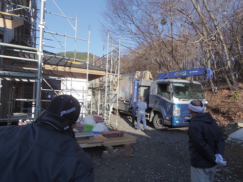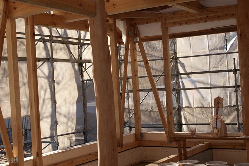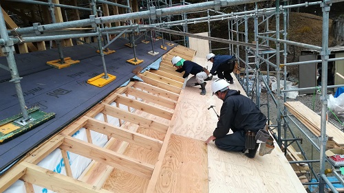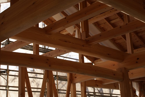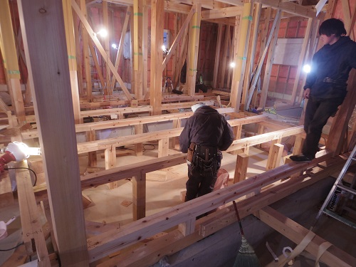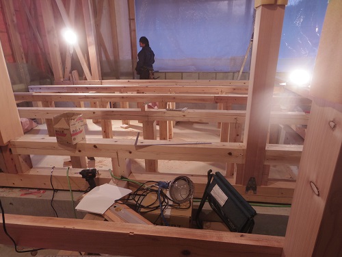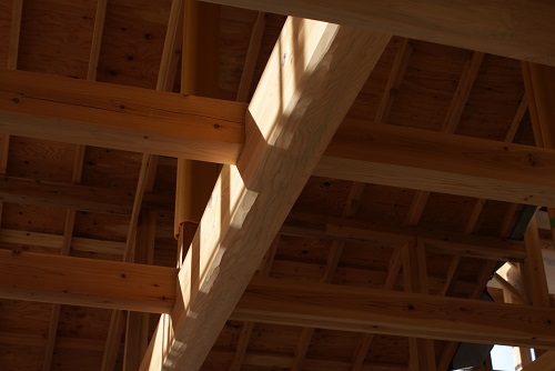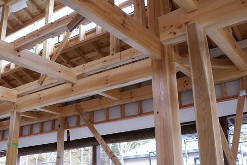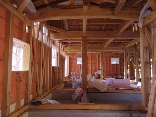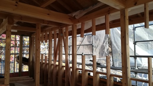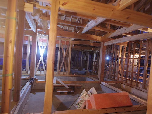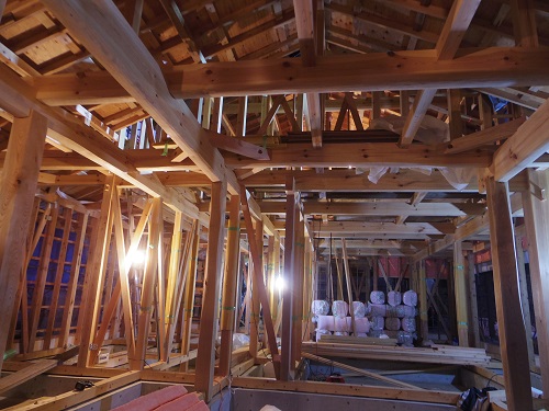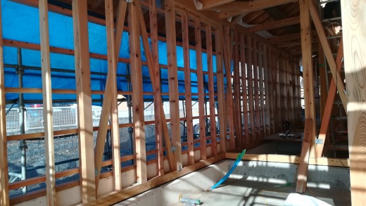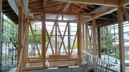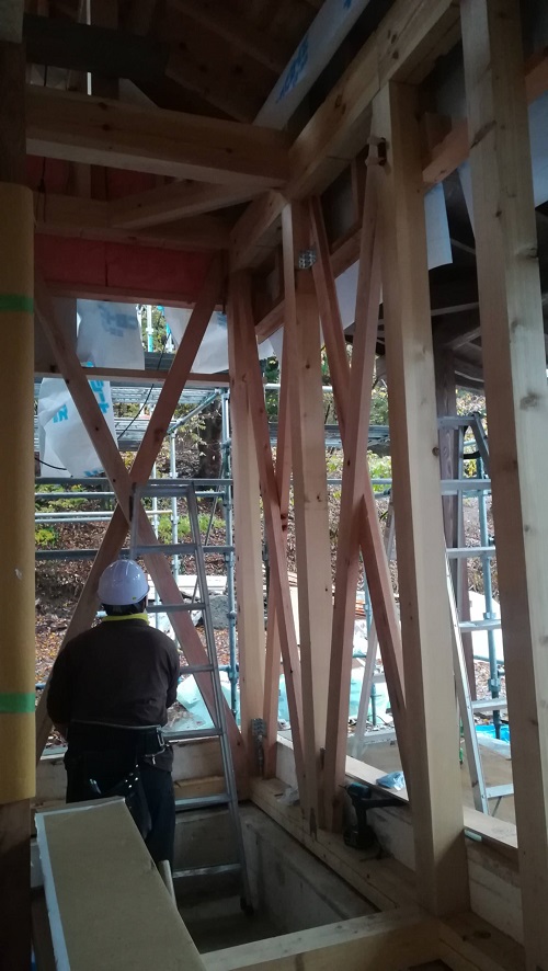 釜石の新築では屋根工事が終わり、筋違いや金物工事に続き外周間柱工事など進んでいます。