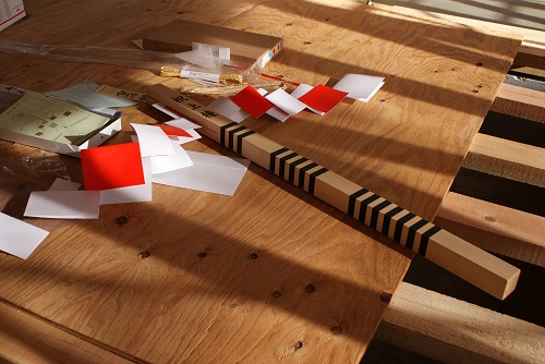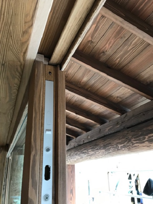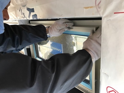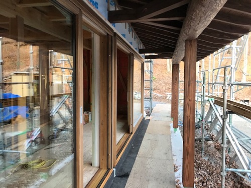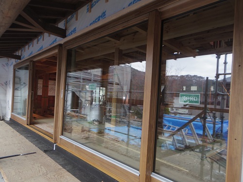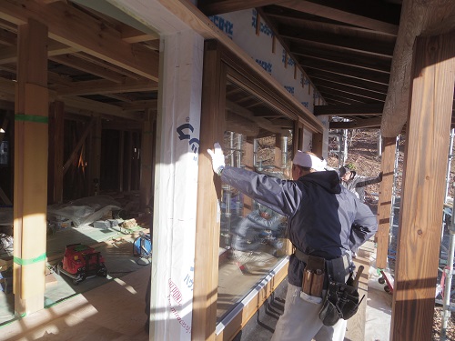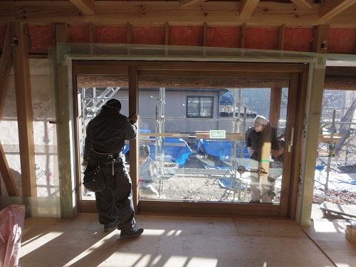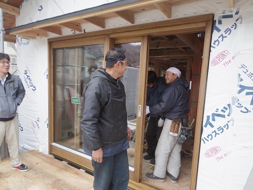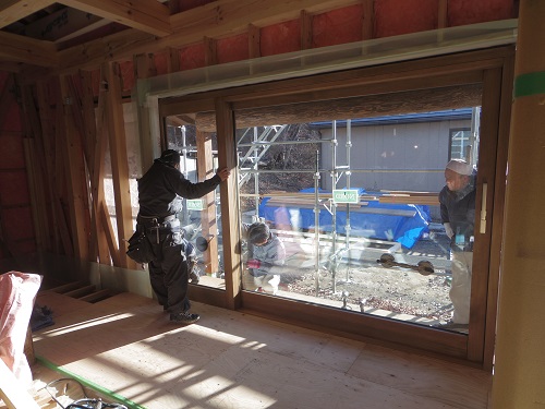 釜石の新築現場に木製サッシが届きすぐさま取り付けられました。