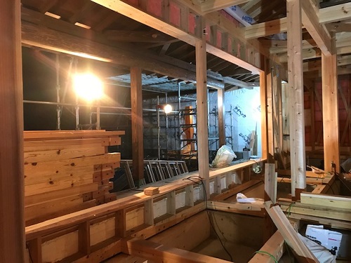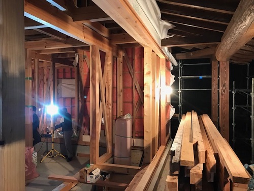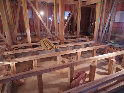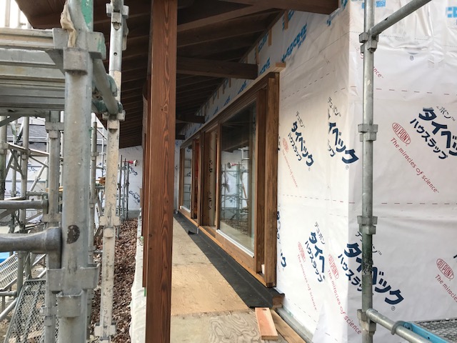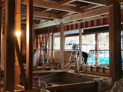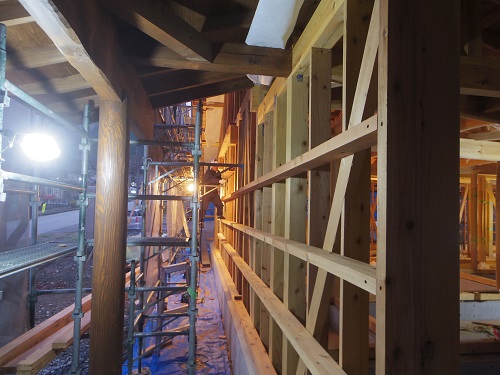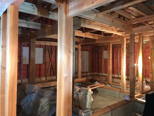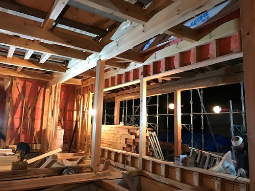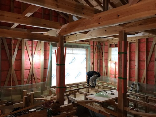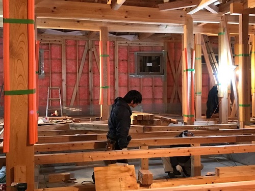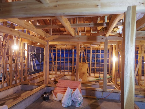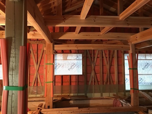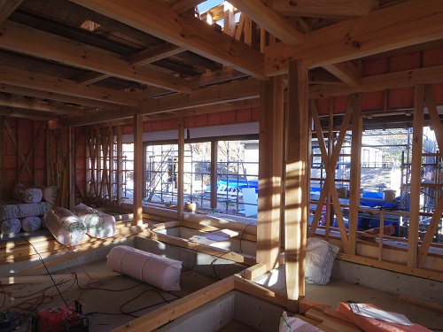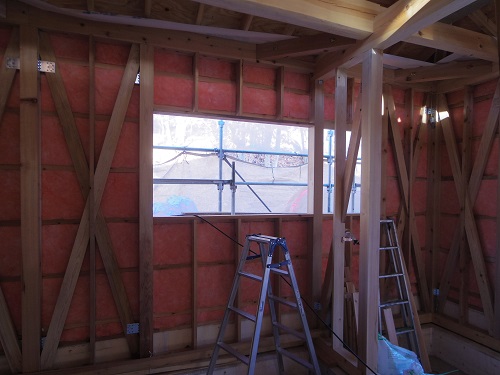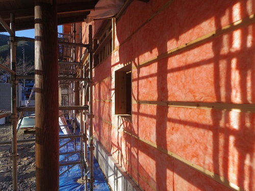 釜石の新築現場は外断熱の下地組が進んでいます。外断熱は105mmの高性能GW16㎏品を455mmスパンで入れ込むのですが、下地組が支えになるので、断熱材が下がることなく、外壁の受け材としても頑丈で、耐震要素も兼ね備えます。