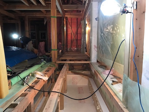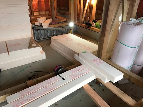 新築現場から届いた進捗写真は、基礎断熱と壁断熱を進める姿でした。