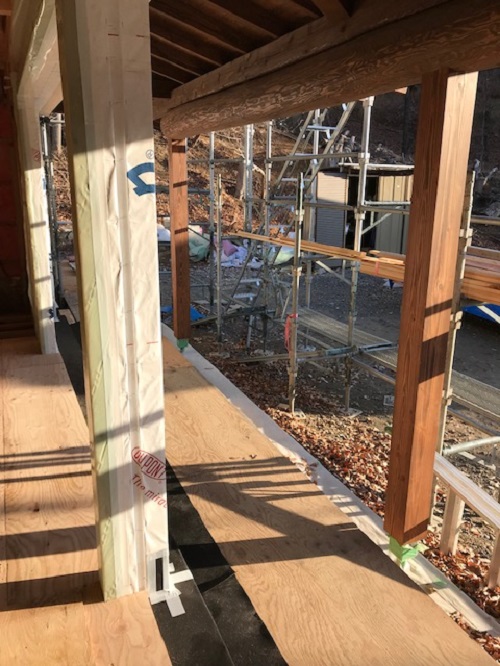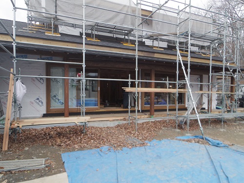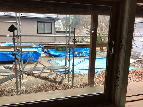 釜石の新築現場から送信されて来る進捗情報写真です。サッシも取り付けられて、冬越し年越し準備万端です。