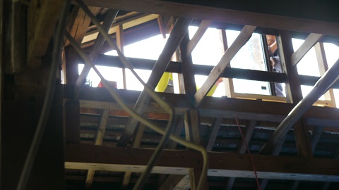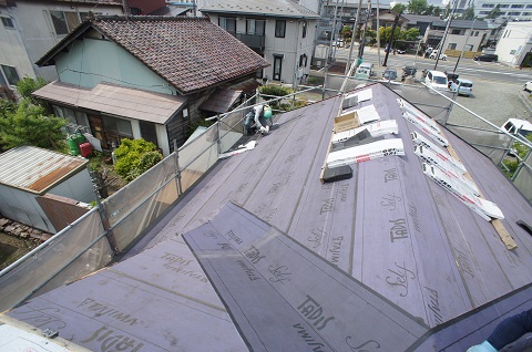 屋根葺きや外壁の修繕工事が進む大改修現場です。すっかり、スケルトン状態になりましたね。