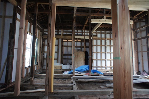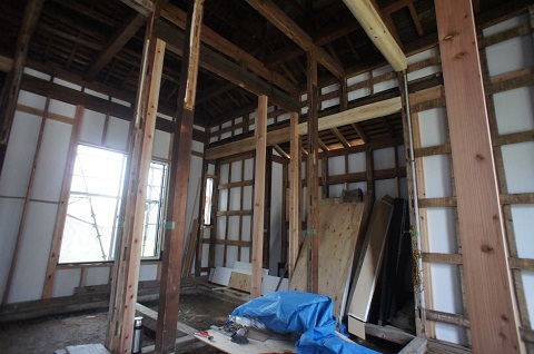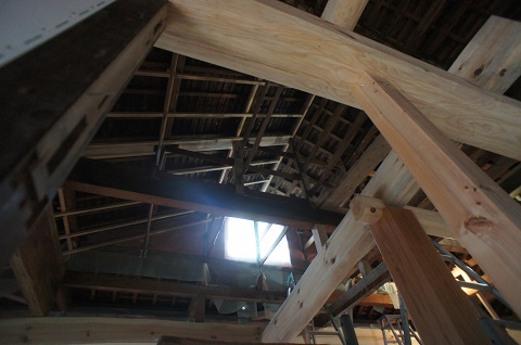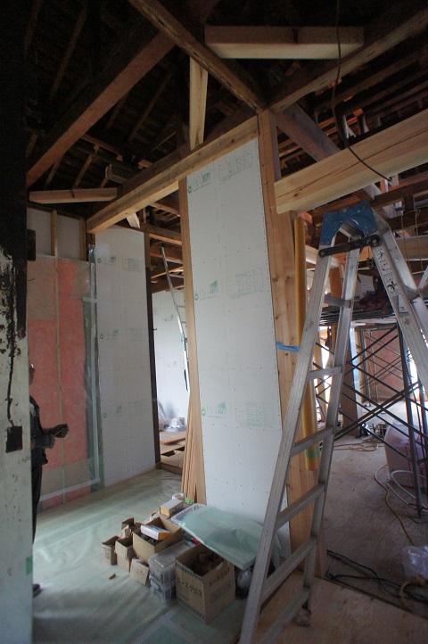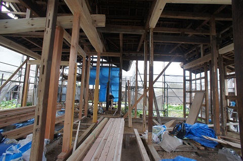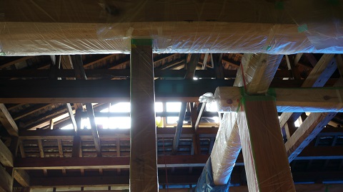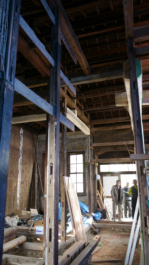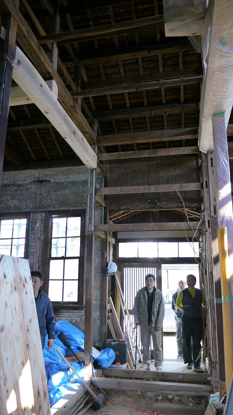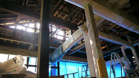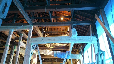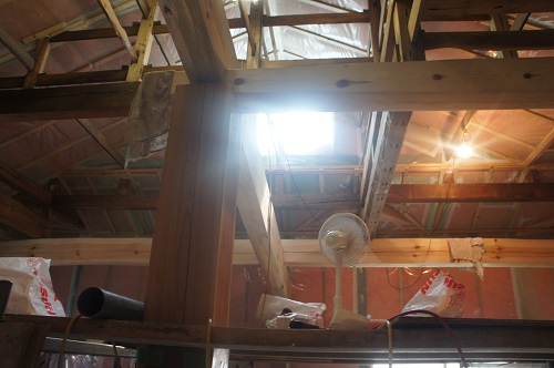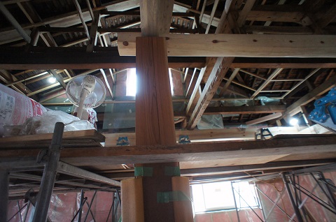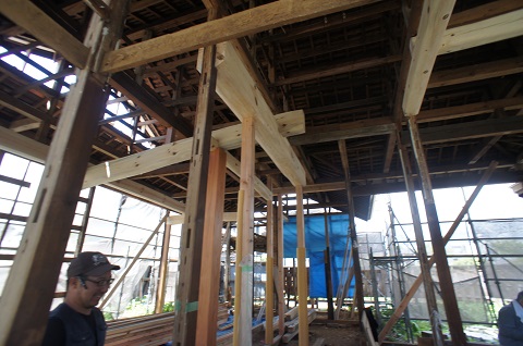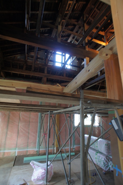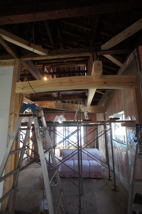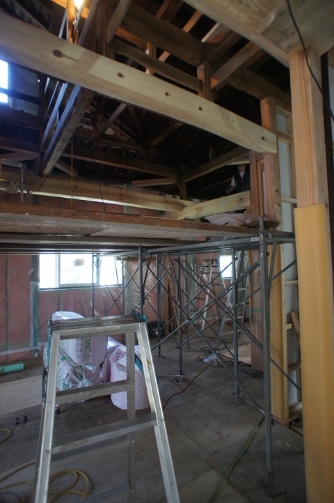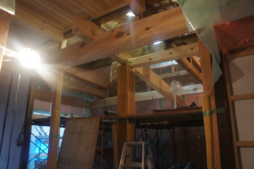 古い構造部と新たに構造補強された新たな綺麗な材との共存空間が素敵な大改修現場です。