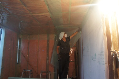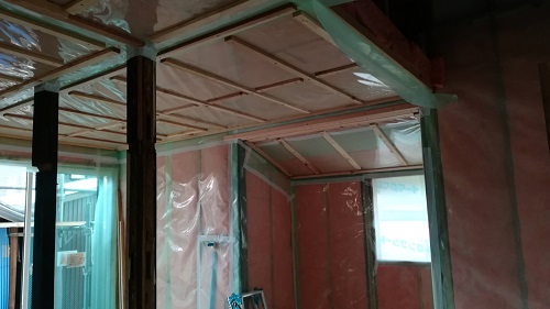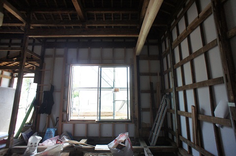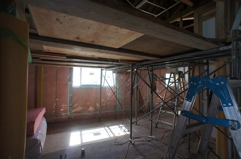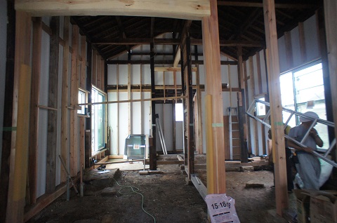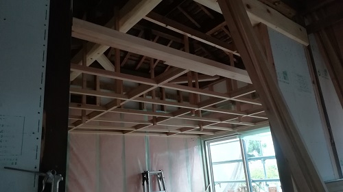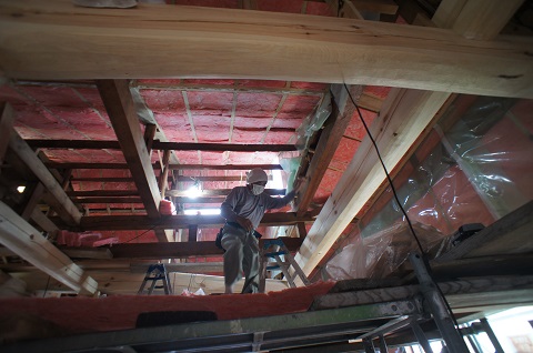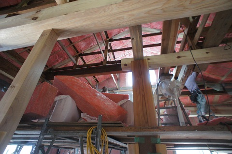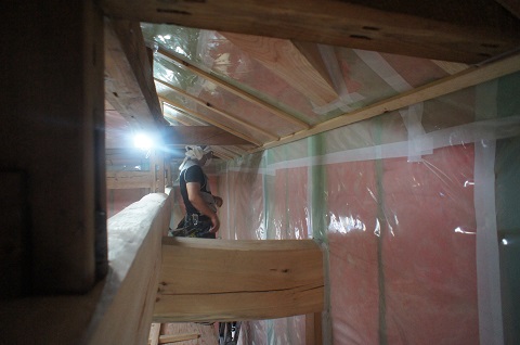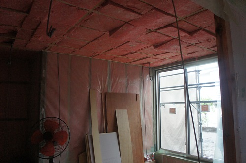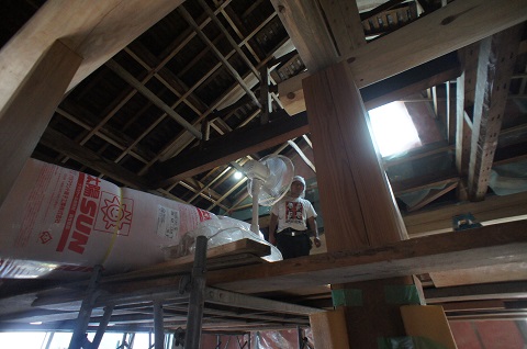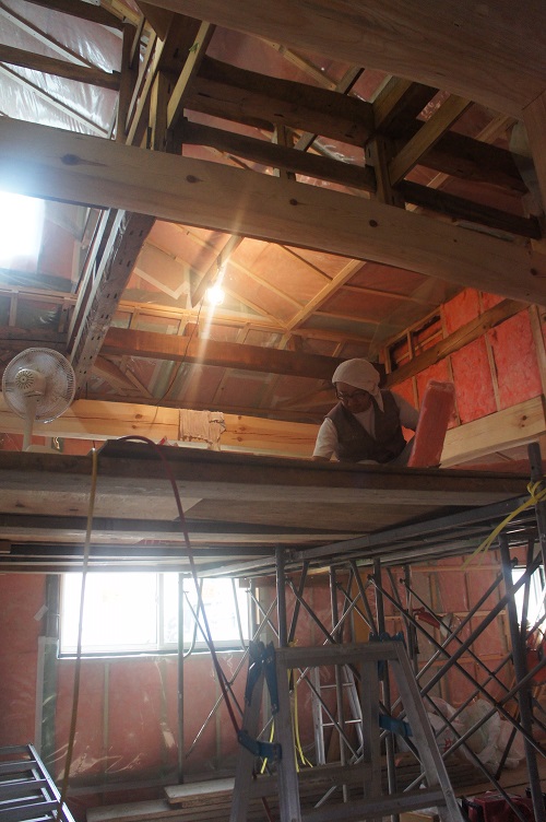 上田の大改修は断熱工事が進みました。連日の厚さで扇風機が活躍してます。断熱された屋根下だと、風が吹くと快適です。