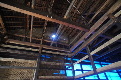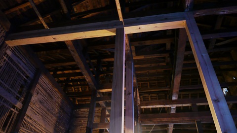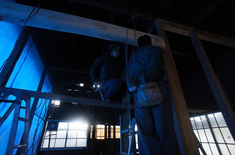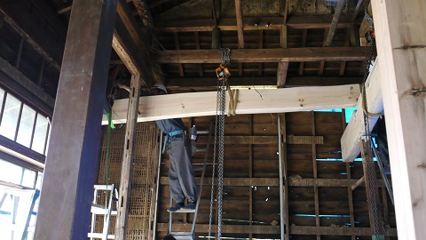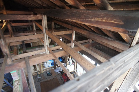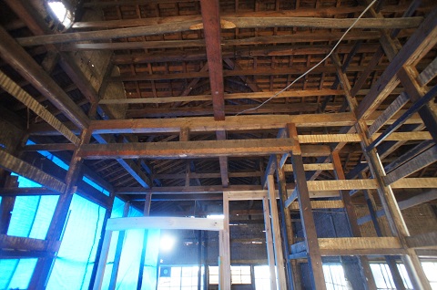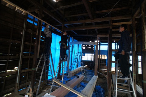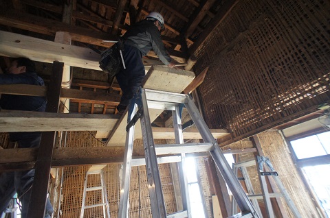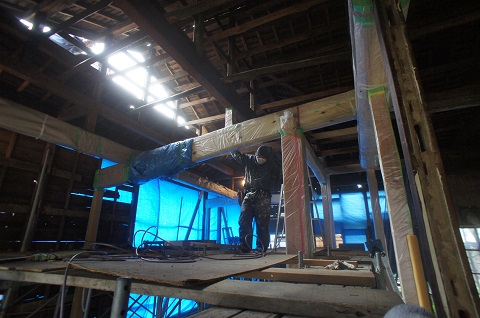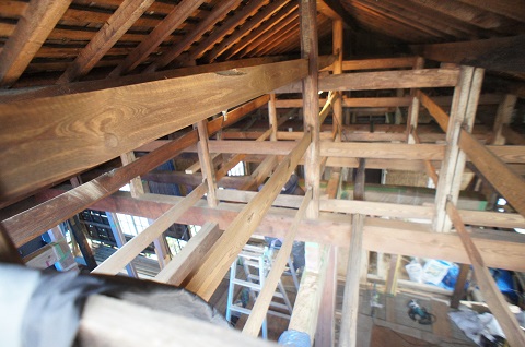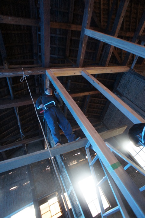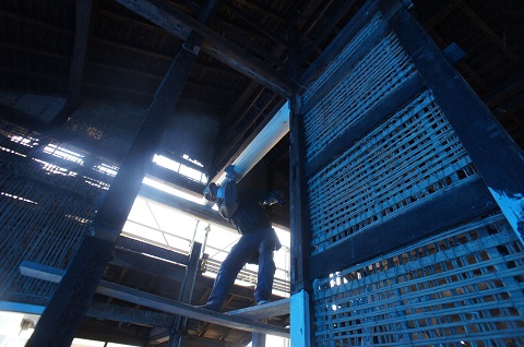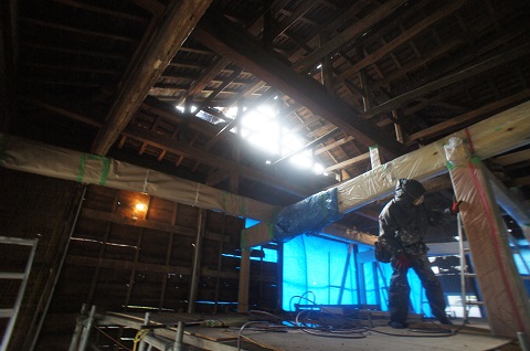 上田の大改修現場では屋根工事と並行して、内部の梁の汚れ落としを行っています。