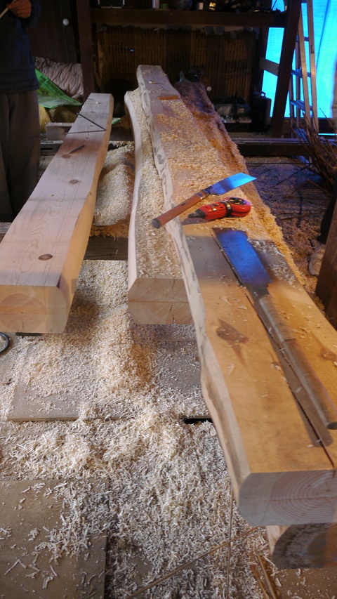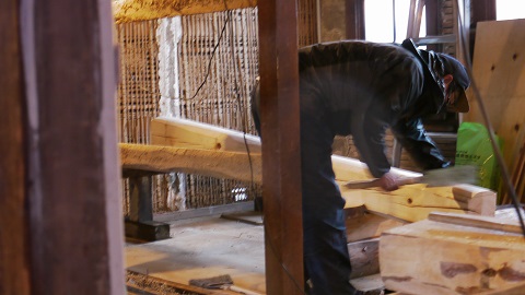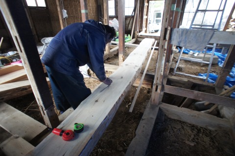 現場で実際の寸法をあたりながら、高橋大工が墨付けをし刻み加工をしています。