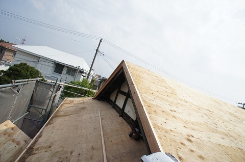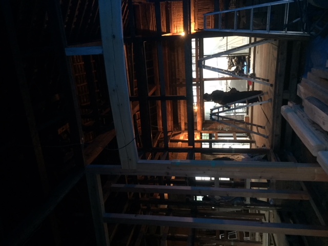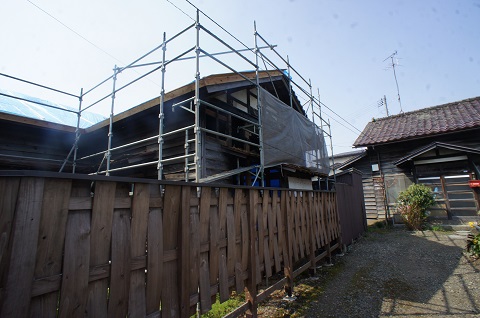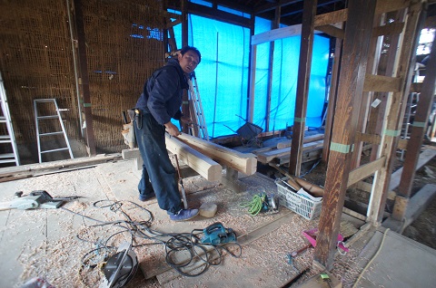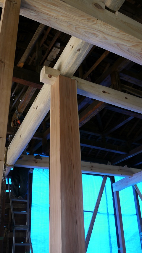 足場造りも大切な仕事です。新旧の梁が混在するこの姿は、大工という職業の素晴らしさがあってのものなのです。人手不足の世の中ですが、職人を大切にしなかった日本人が招いた汚点なのではないでしょうか?今回のこの現場のメンバーは中堅の大工たちです。私と打ち合わせしながら構造の要点を抑えて、自らの工夫で考えながら工事を進めてくれていました。職人を大切にするには、活躍できる現場や木材が必要だと私は思います。