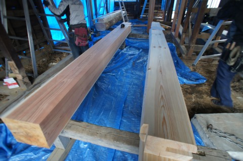 今週末あたりから赤松の6mの太鼓梁や8寸角の綺麗な赤身の杉大黒柱、1尺クラスの赤松の丸太梁等が豪快に組まれていきます。見どころですね。