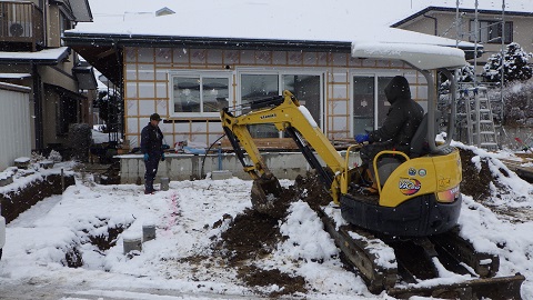 雪降る中ではありますが、本舘の新築現場では外部の車庫工事が進んでいました。今週からは内部も適宜進めたいところです。