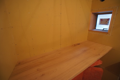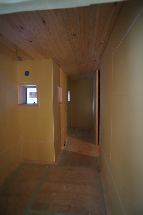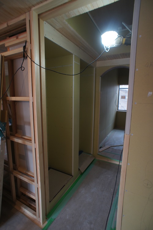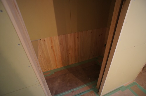 店舗部分の内装が綺麗に仕上がって、住宅部分の大工工事中の大改修現場ですが、押せ押せ工事中の東山の大改修工事の大工工事が完了後に応援の手が増える予定です。洗面室の壁は青森ヒバ材で美しく張り上がっています。