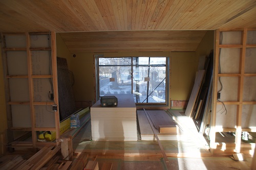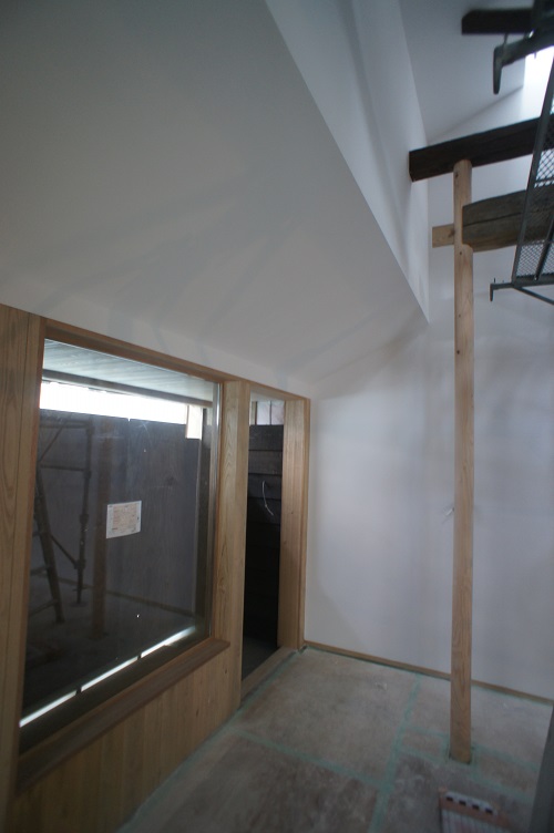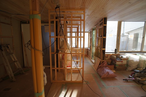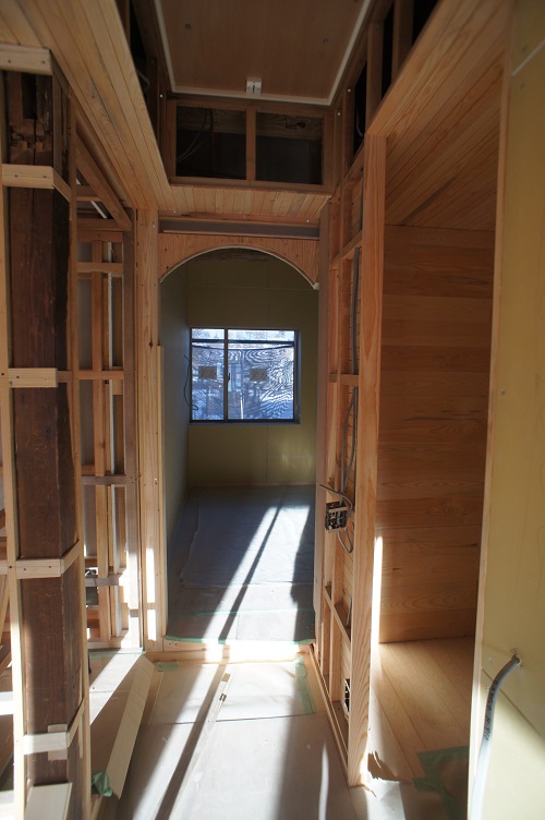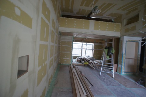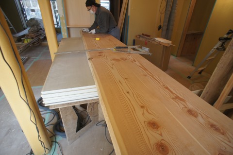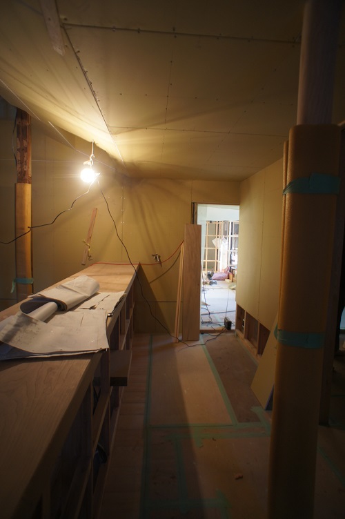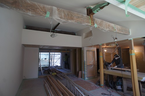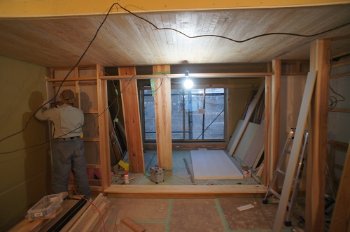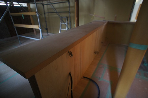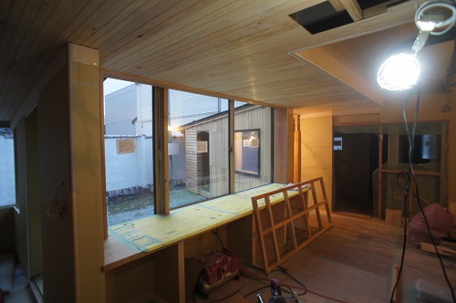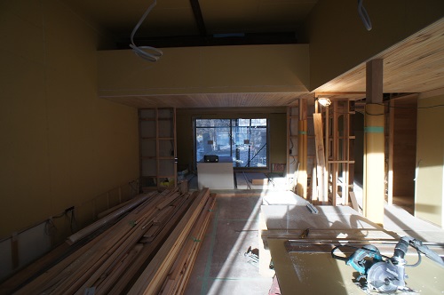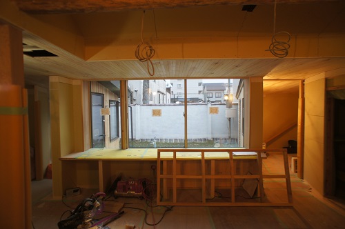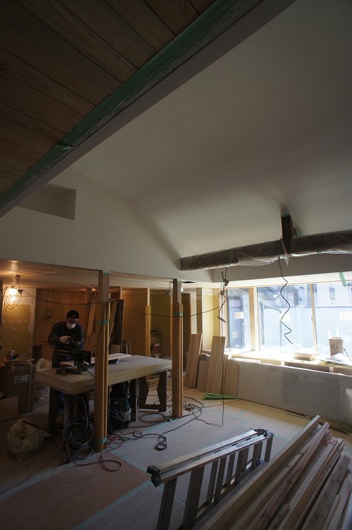 材木町の大改修現場の店舗側大工造作工事は大方です。今後内装工事や建具の吊り込みを頑張り完成を目指します。