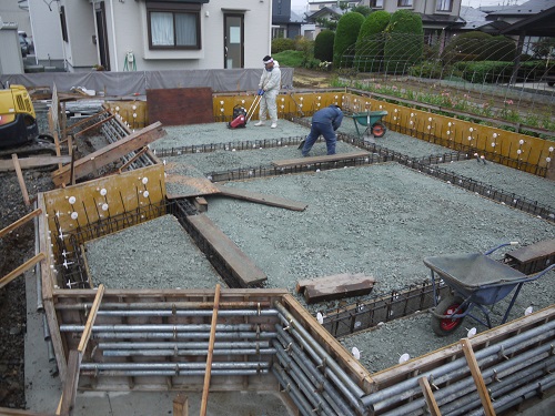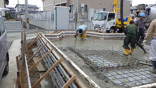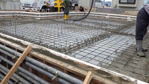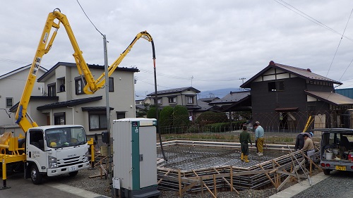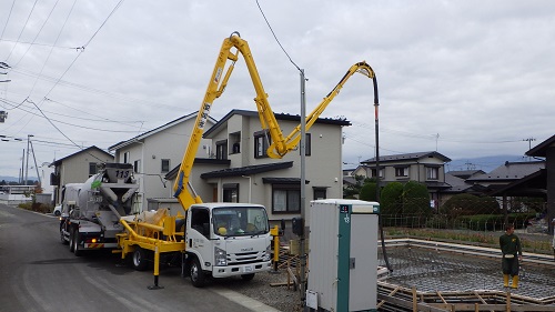 配筋検査も無事合格して、外断熱枠も取り付け、本日コンクリート打設している新築現場です。