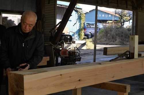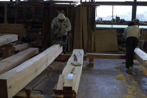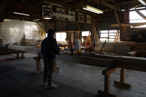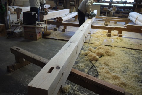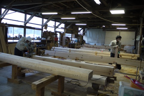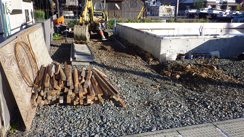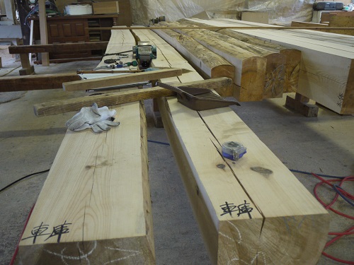 基礎工事と並行して構造材の準備段取りも進んでいます。