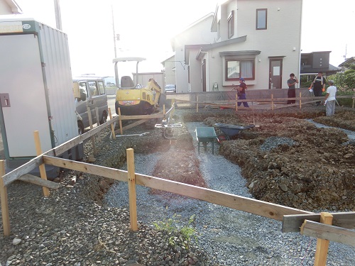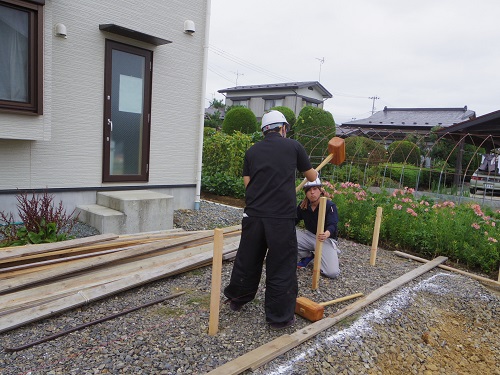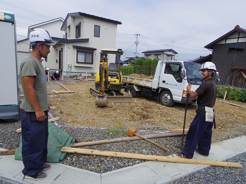 新築工事の遣り方工事を20代の若手が三人で応援しました。基礎も造れる大工が昔は当たり前だったのです。なので、大工さんは家造りのプロ職人として、一本立ち出来ていました。しかし、時代の流れはそうした事をしなくなり、住宅会社の効率と利益追求のみを優先した分業化の家造りプレハブ化の家造りとなってしまいました。そして、どこもかしこも、職人不足で困窮する世の中を作り出してしまいました。でも当社では、この写真の中に確かな次世代を担う若き職方が居て頑張らんとしています。現場の明るさもあって、とても嬉しく思います。