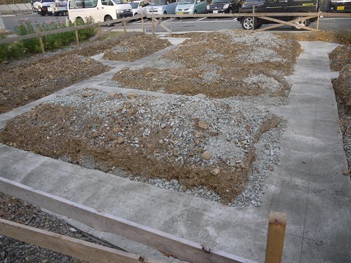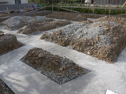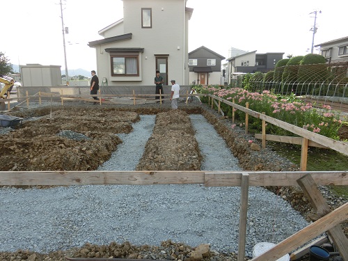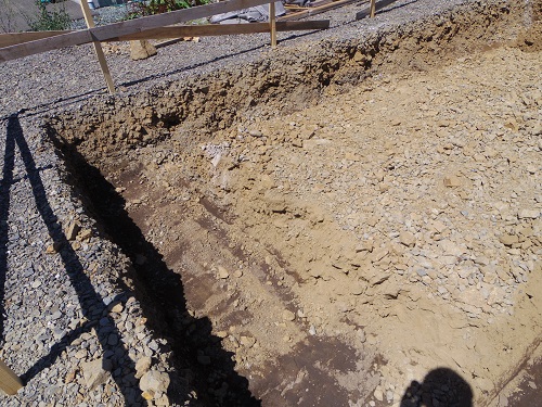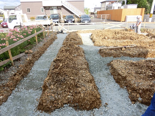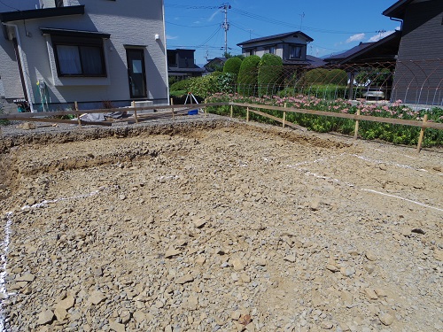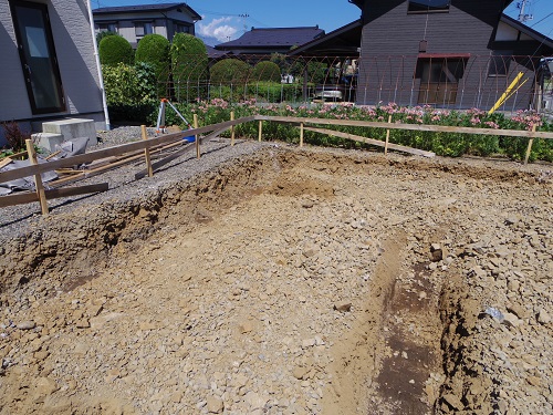 地中梁部の根伐りが進んだ新築現場です。やはり、掘り上げると柔らかい地盤が出てきてしまいました。でも荷重を引き受ける地盤面は頑丈で、更に2.7m下には岩盤状に固い地層も確認できているので、安心です。むやみに全面掘り上げてしまっては、逆に弱くするところでした・・・