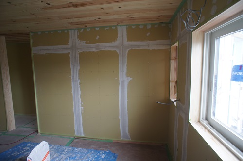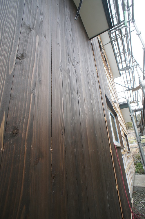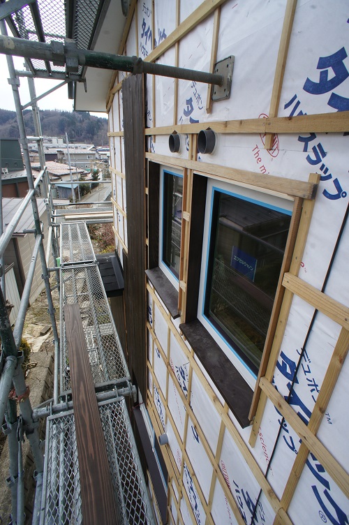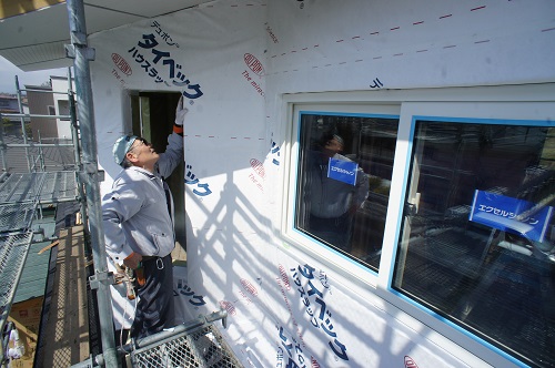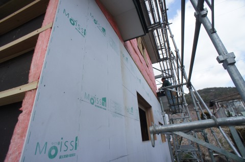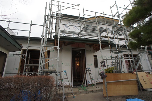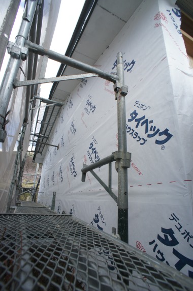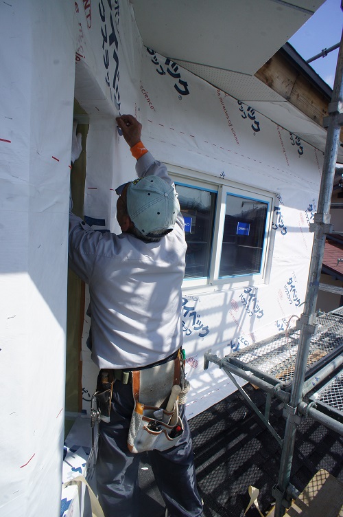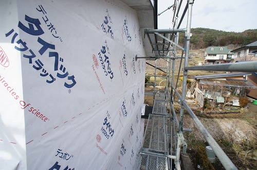 東山の大改修工事では防火構造のモイス張り込みが急ピッチで進められております。モイスを建物1面張り終えるとすぐにタイベック(透湿防水シート)で建物を覆うように張っていきます。
