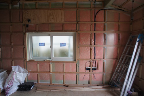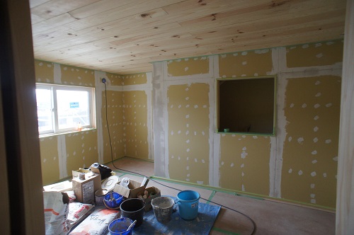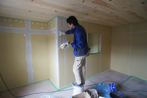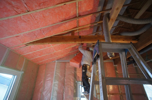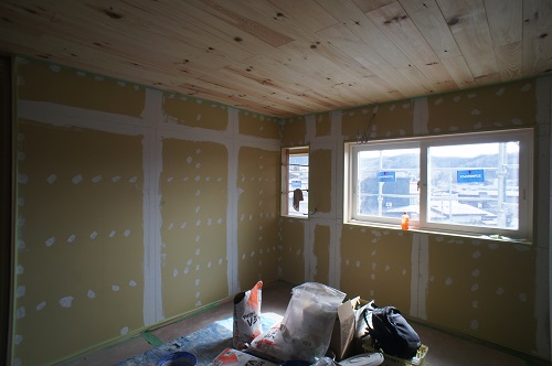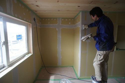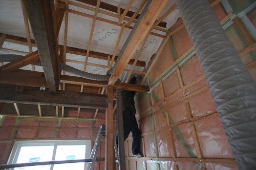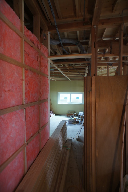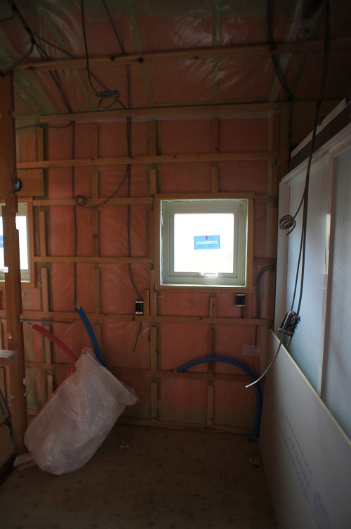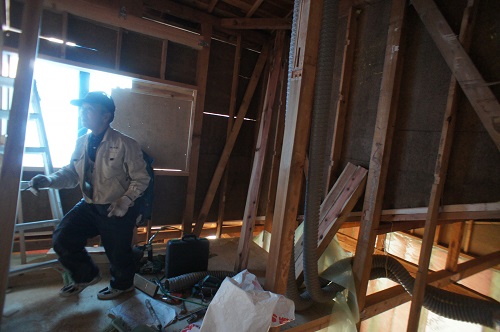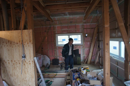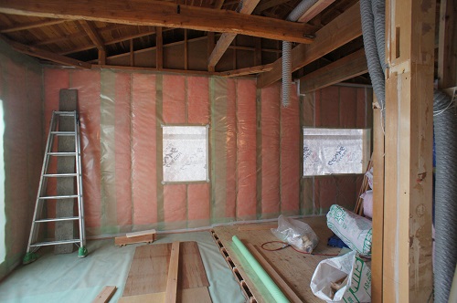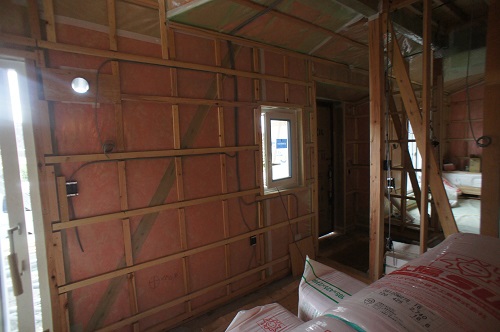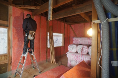 内部では充填断熱工事もコツコツ進んでいます。グラスウールは施工精度が大事です。とても丁寧に施工されていますね。
