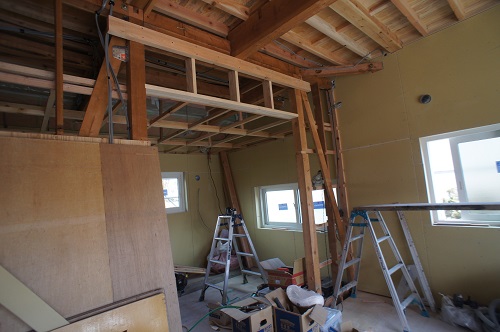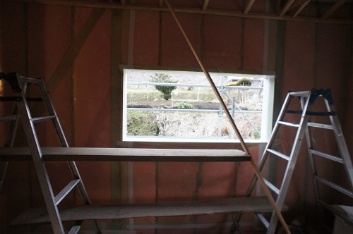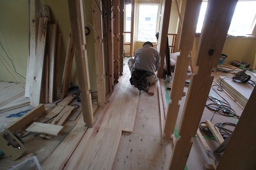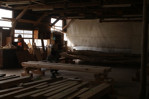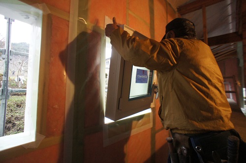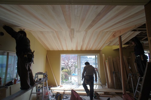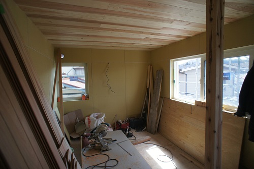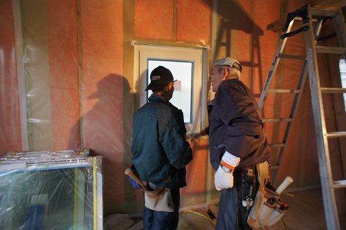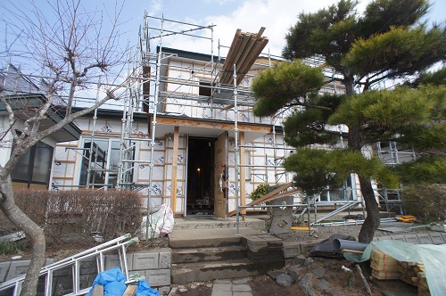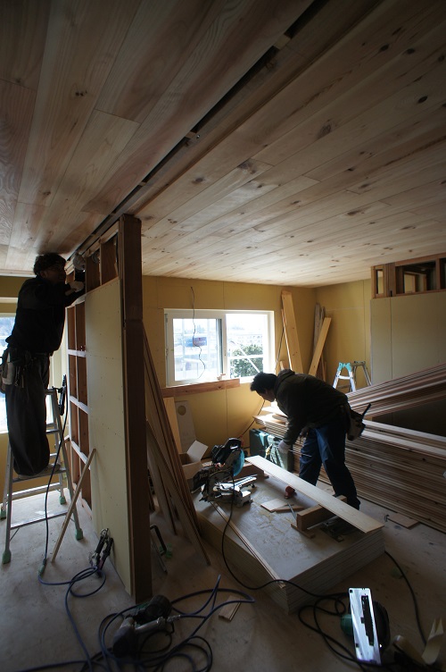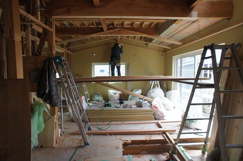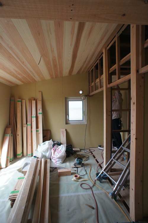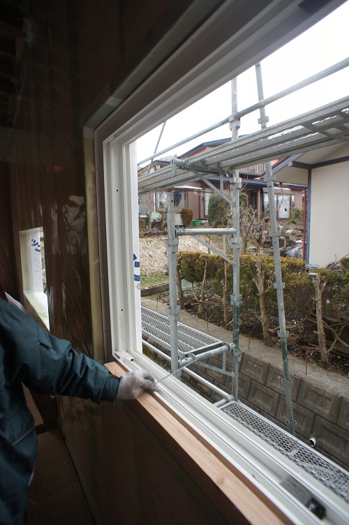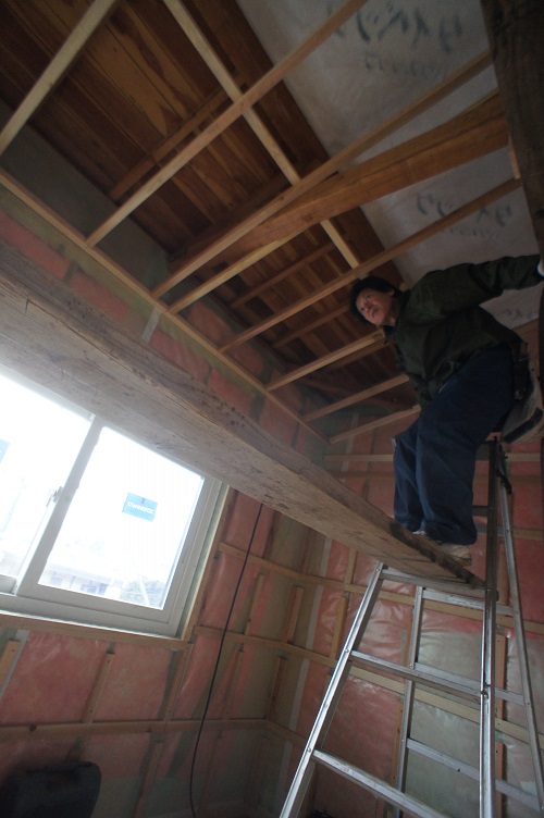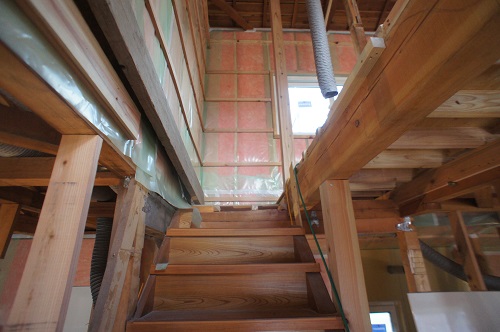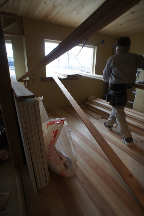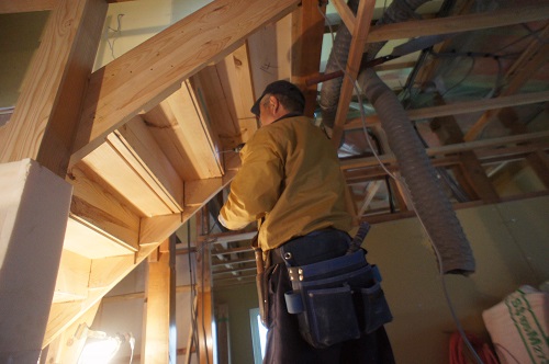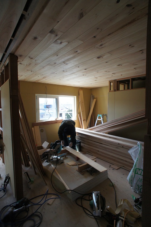 断熱工事が進みサッシの取り付けも進んでいる大改修現場です。好摩では、造作材の加工も進んでいました。