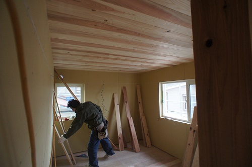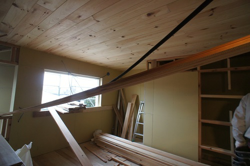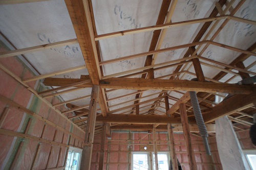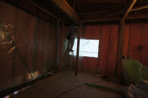 断熱工事後の防湿工事も進み屋根断熱が始まりました。