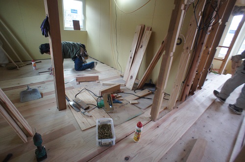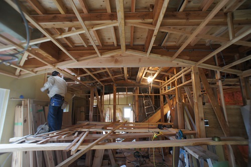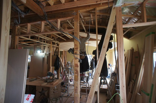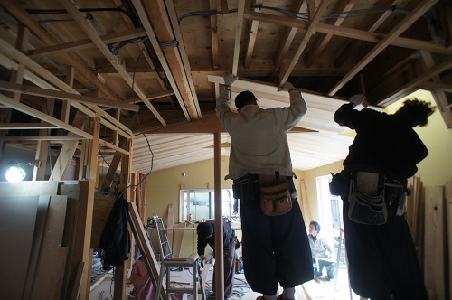 東山の大改修現場では、内装下地工事と外壁工事がスタートいたしました。1階では大工さんがひしめき合いながら頑張ってくれていました。