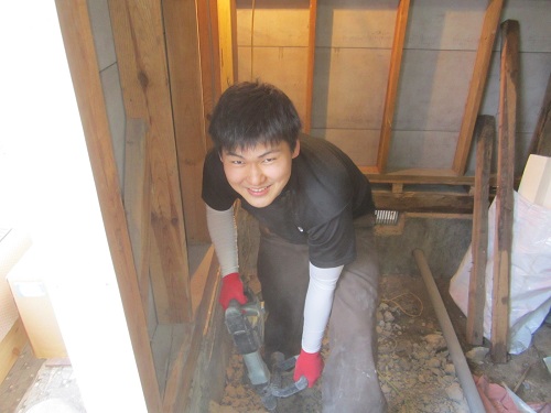 新人の副士が初のハツリ仕事に汗を流しています。元ラガーマンパワーです。