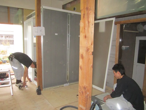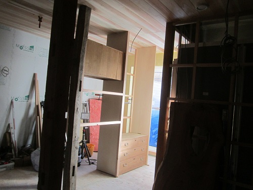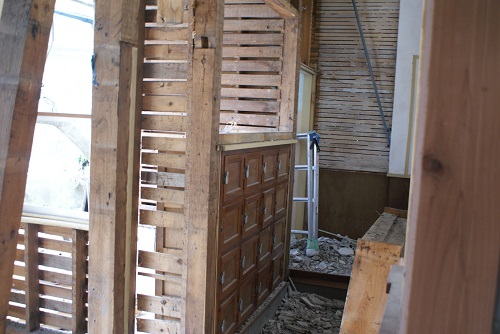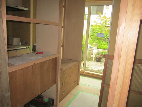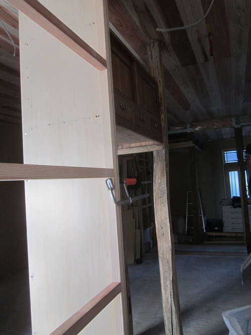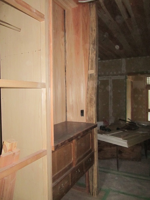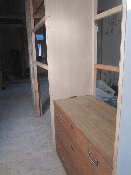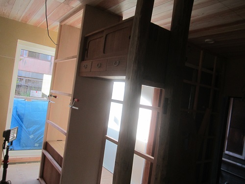 岩泉町での改修工事現場の進捗ですが、古い桐タンスの再生再利用をさせていただきました。