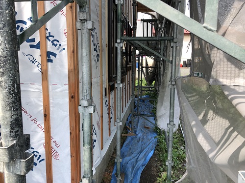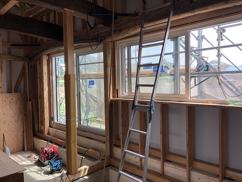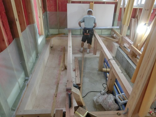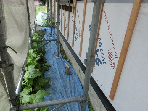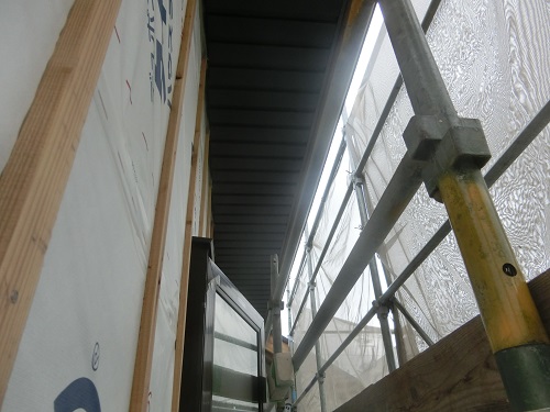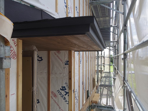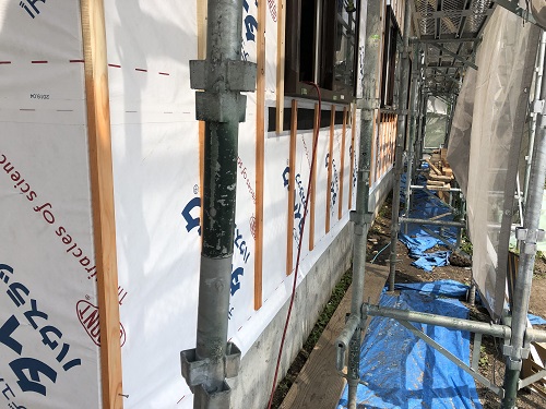 川口の新築現場では、雨樋を取り付けて外壁を張り始める段取りが出来ました。内部は床の張込みが進んでいます。