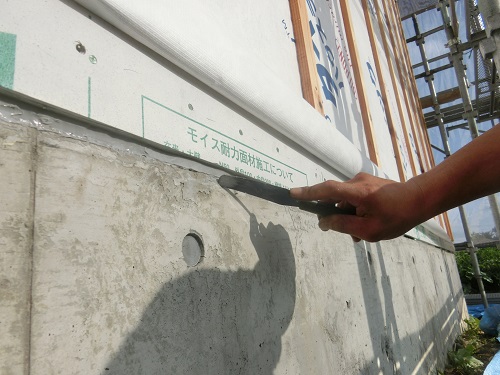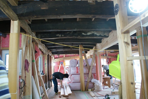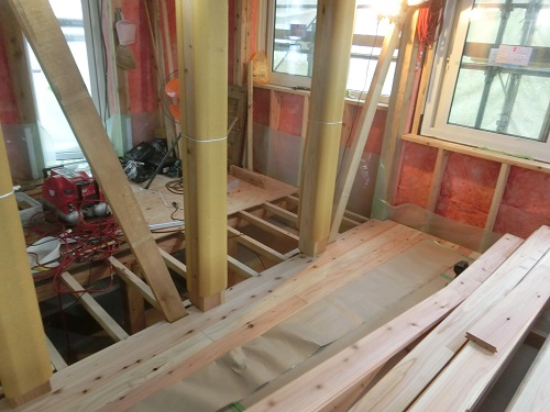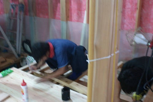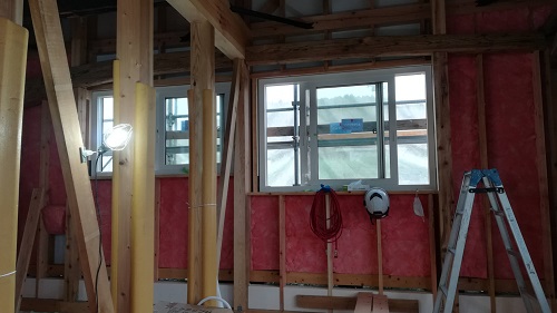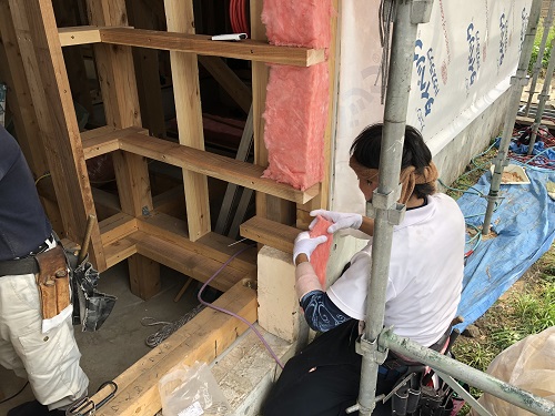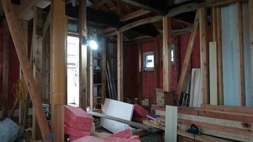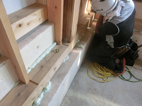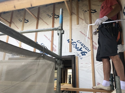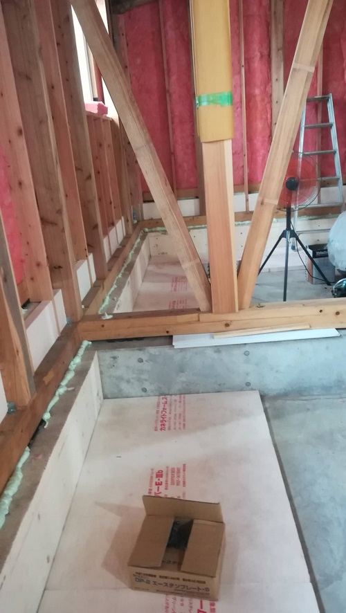 川口の新築工事は、壁断熱と1階の床下地の大引き取り付けなどが同時進行しています。