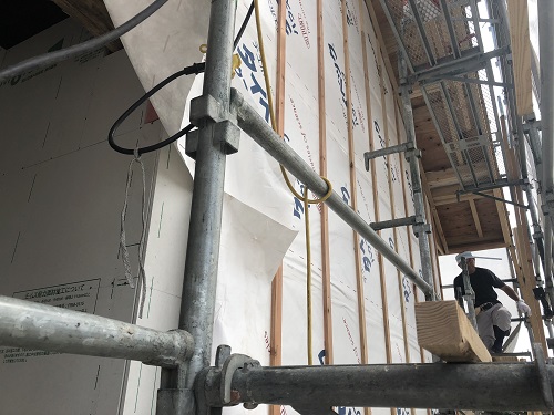 お盆休み前に目標の外部囲いを終えた新築現場です。休み明けからは、軒天と内部断熱工事などを進めながら電気配線もして、外壁工事へと進めたいところです。