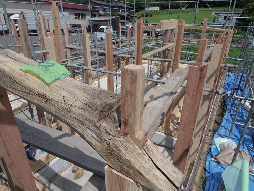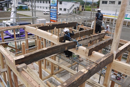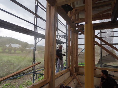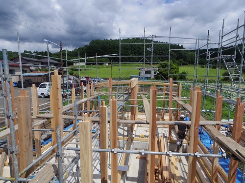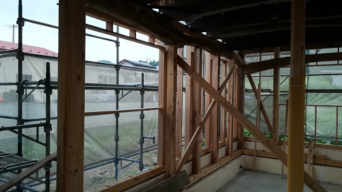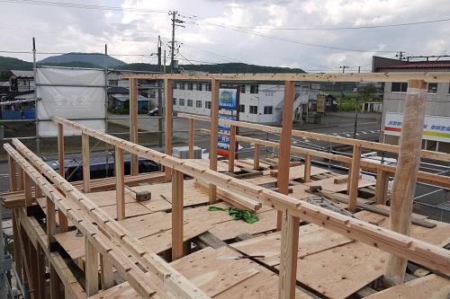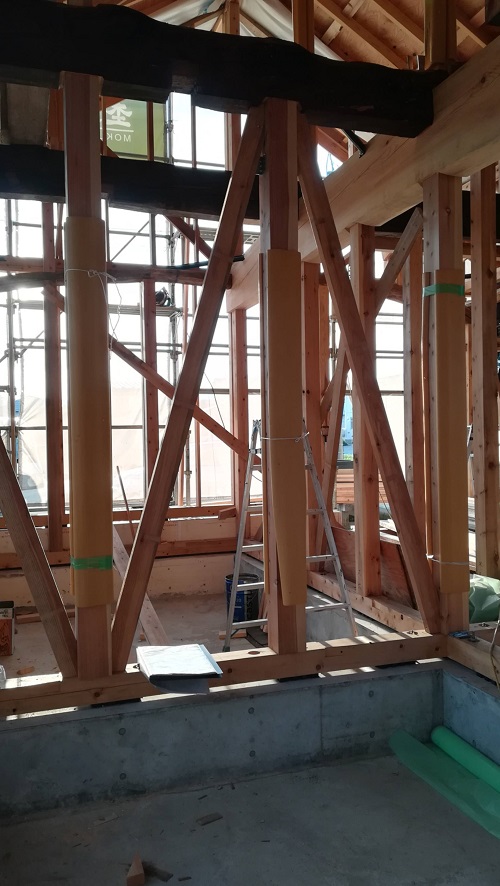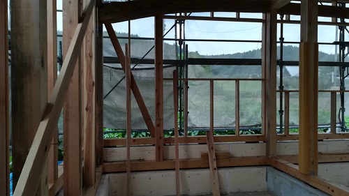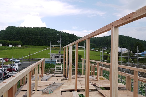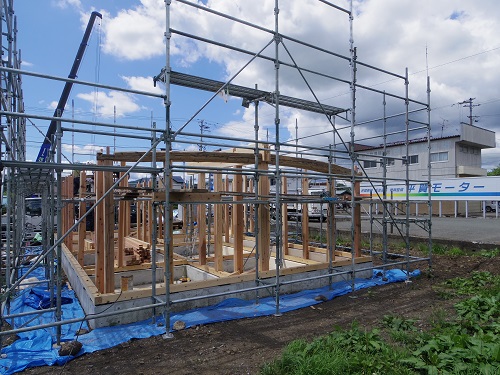 岩手町川口の新築現場は、構造筋違いや金物の取り付けと外部開口部下地の取り付けなどが進んでいます。