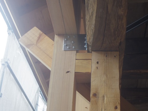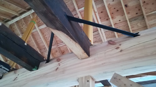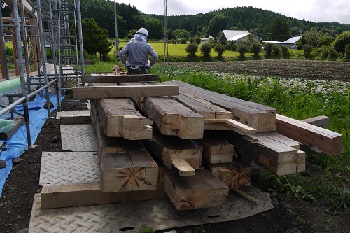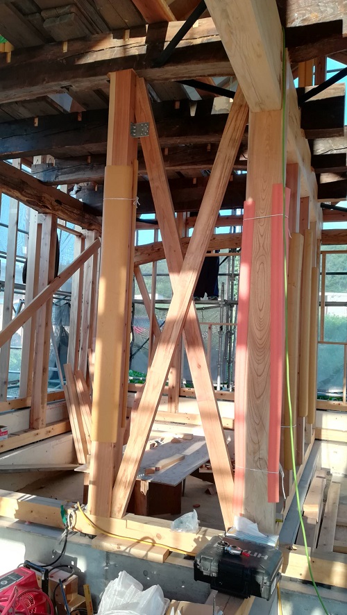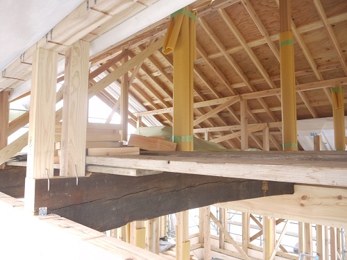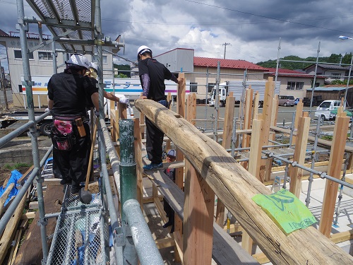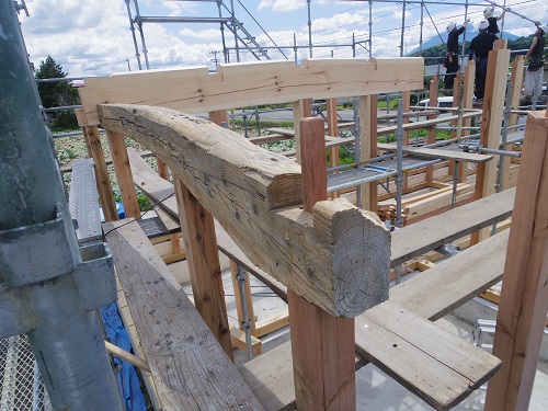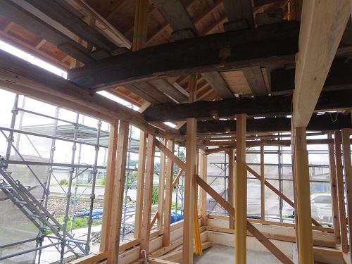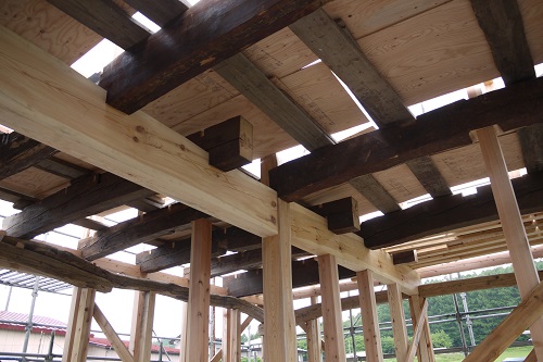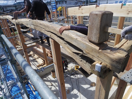 墨を付けた大和田がこの組み上がった古材の美しさに感動しております。