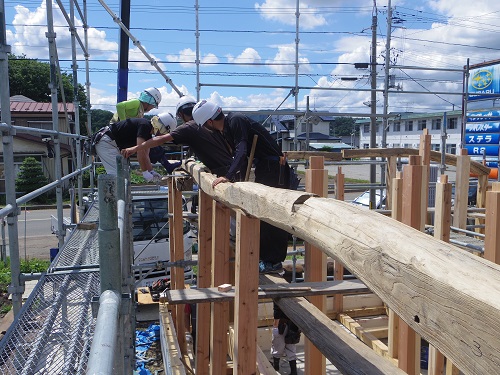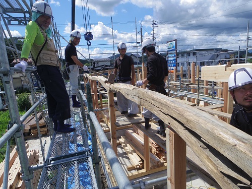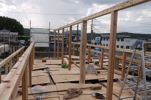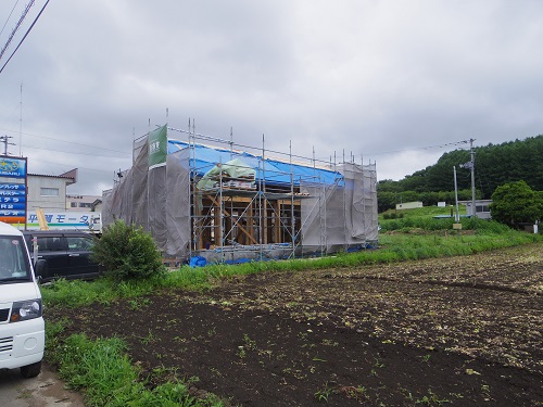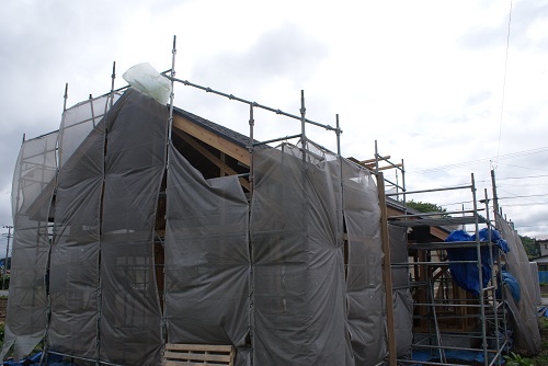 川口の新築工事現場では、構造工事が良い速度で進行して、外部の構造面材の下地も進みましたので、お盆休み前には外部の囲い込みまでは終えたいところです。