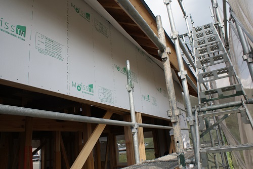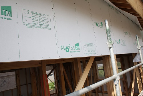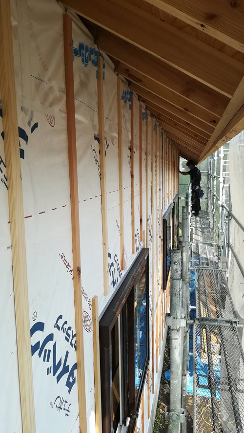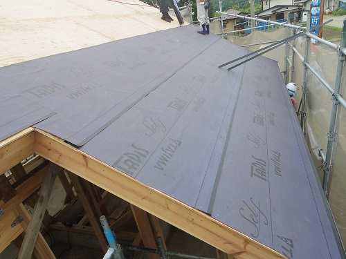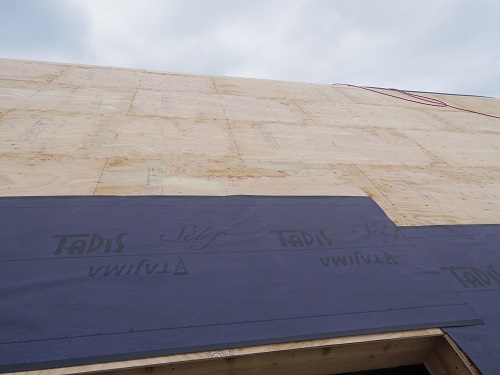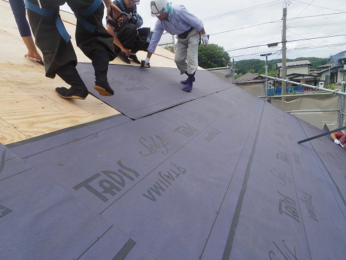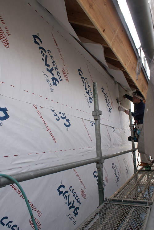 川口の新築現場は、構造面材を張り上げて、タイベックシートの貼り付けまで進みました。
