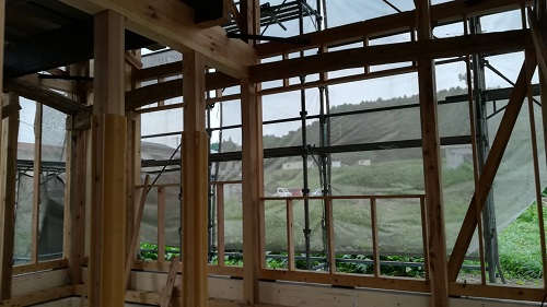 川口の新築工事は外部サッシを取り付けて外壁下地工事も進みました。2階の床根太も進んでいます。