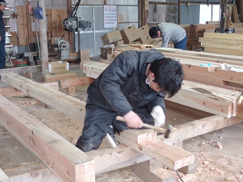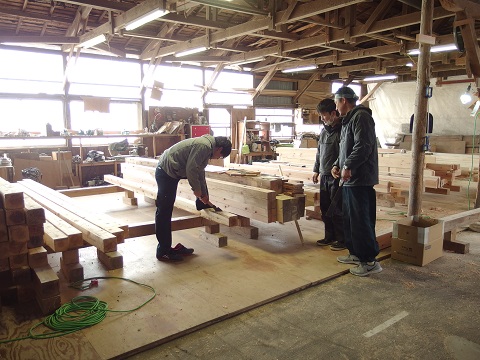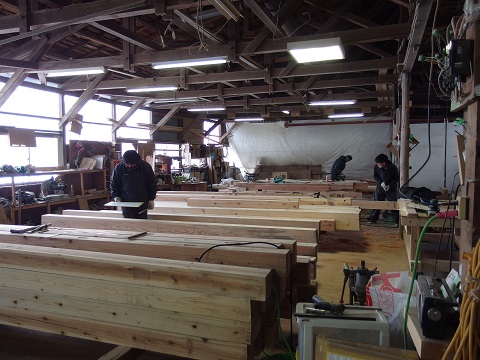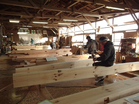 手前に中堅40代、奥に定年退職後再雇用の60代、その間で20代の若手大工が一緒に刻んでいるのは八幡平の新築現場に向かう構造材です。まさに技術の継承が成されている好摩の加工場です。