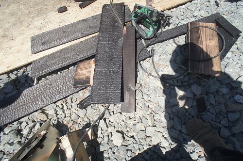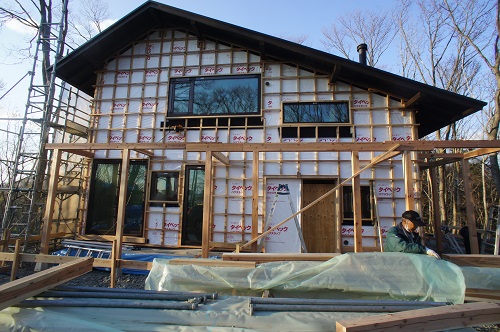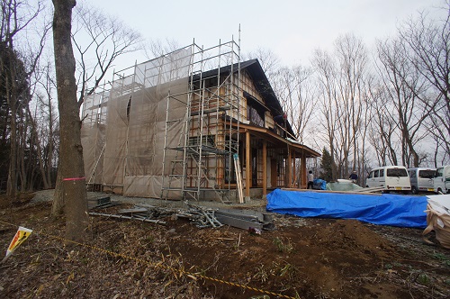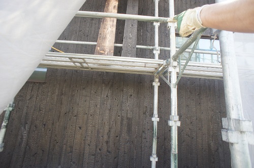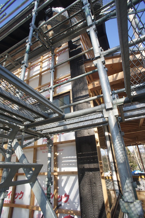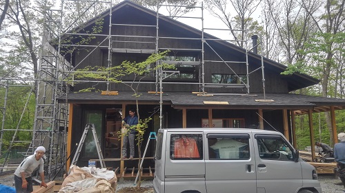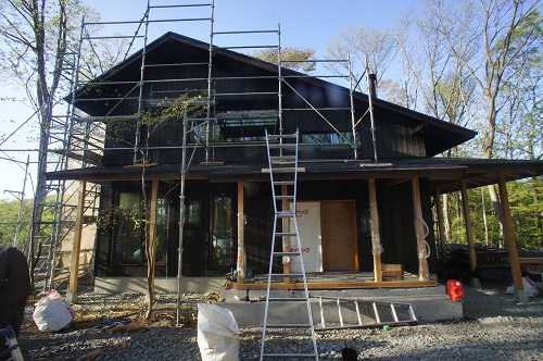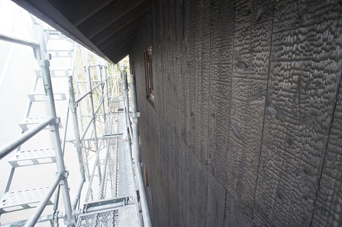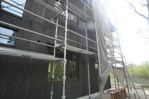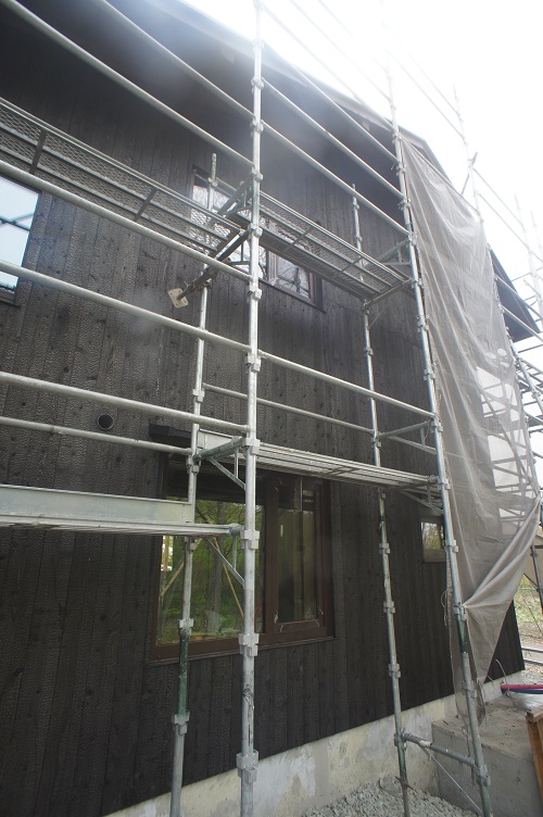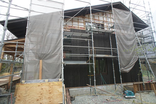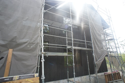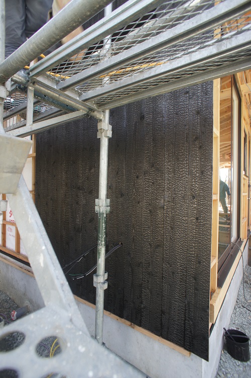 外壁焼き杉板張りが進む新築現場です。