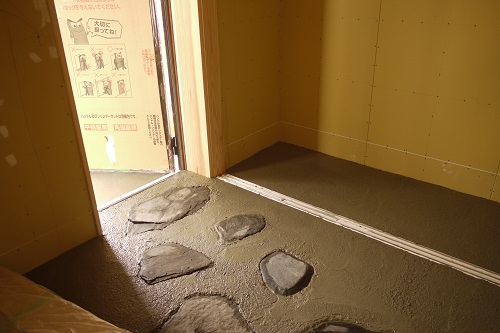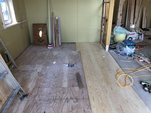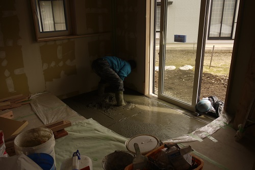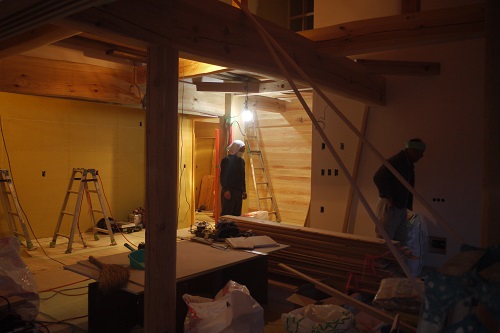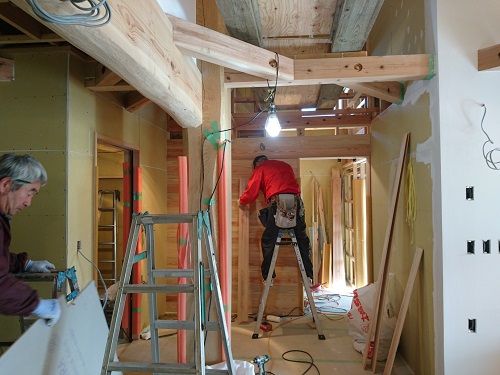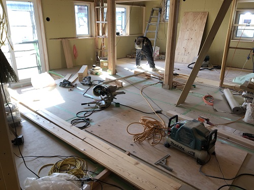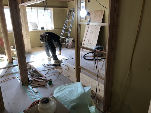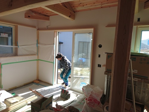 外部内部の土間コンクリートの打設が進んで、内装と大工工事も同時進行している雫石の新築工事です。