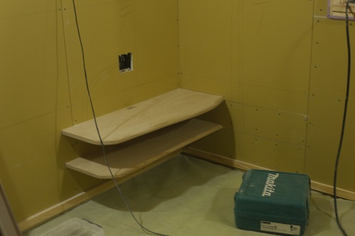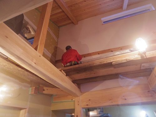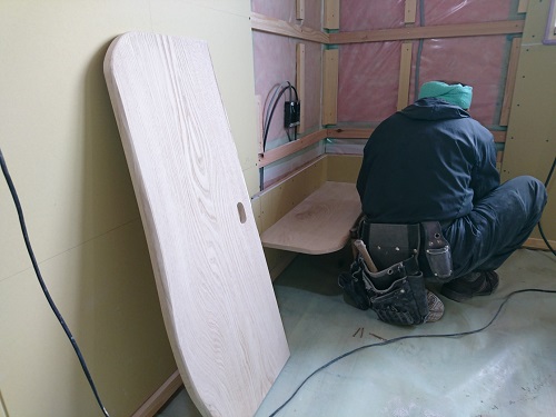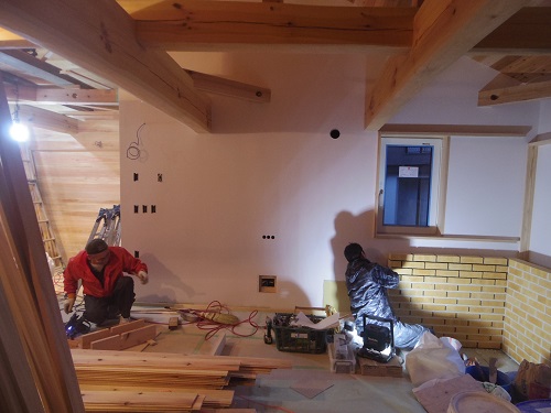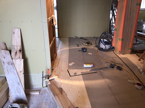 好摩作業場ではカウンター加工がなされている雫石の新築現場の進捗です。