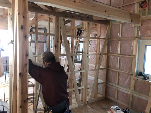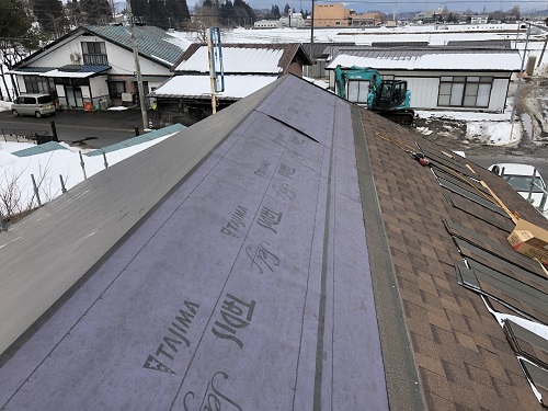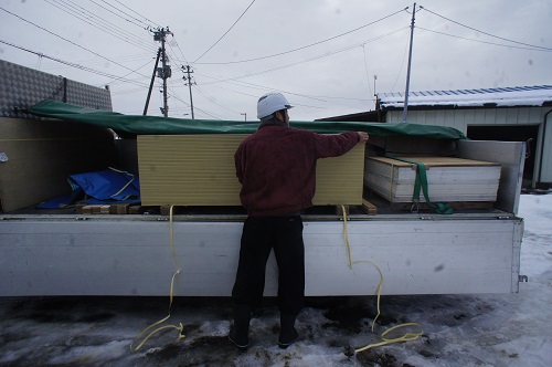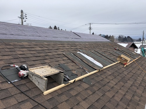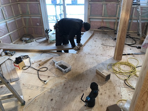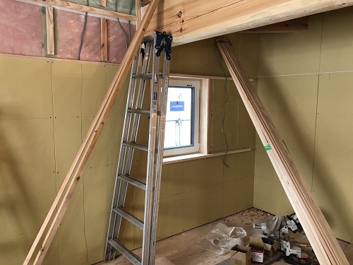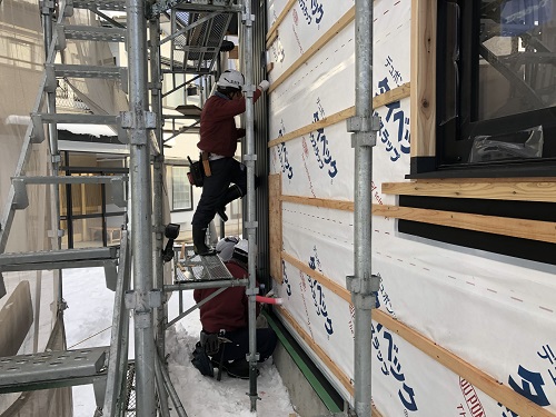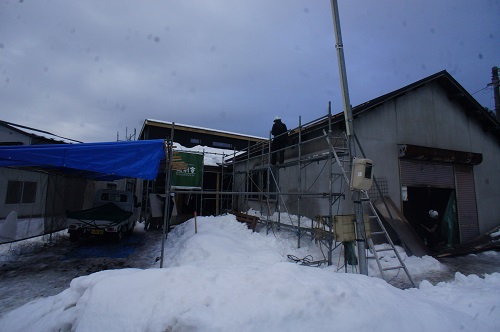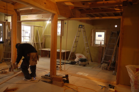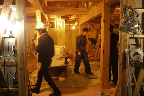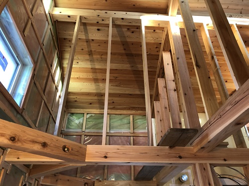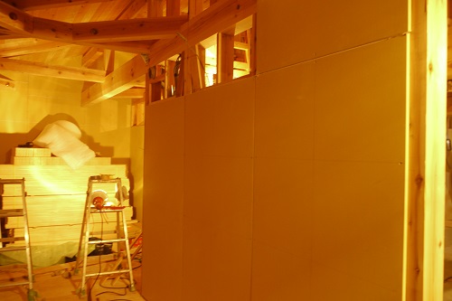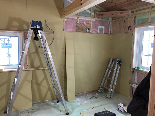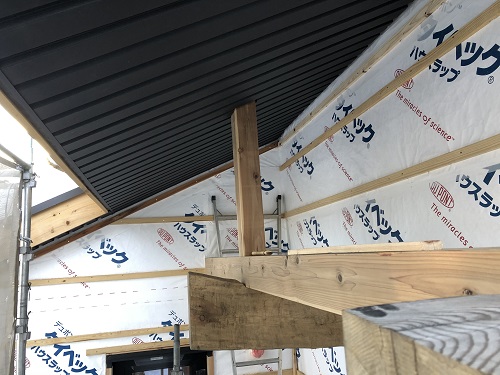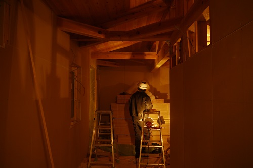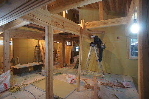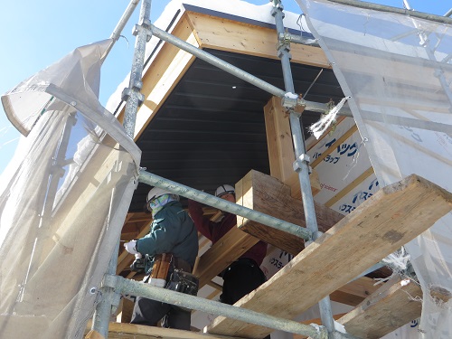 小笠原多能工大工が若手四人を引き連れて既存部屋根も張り込んでいます。外壁も張って、若手の活躍が目覚ましい現場です。石膏ボードも高齢の大工さんに代わって若手が運んでくれるので、頼もしい限りです。