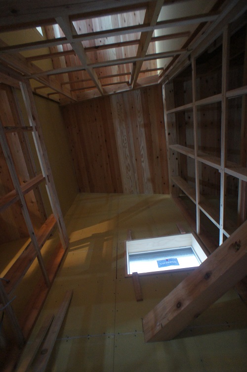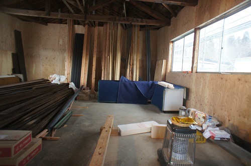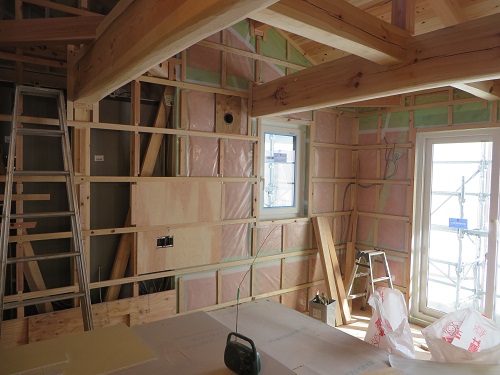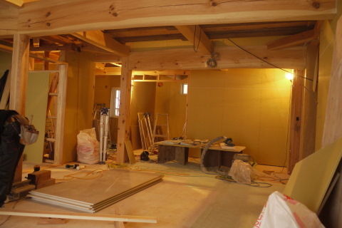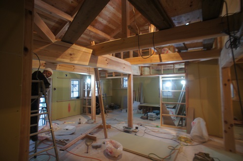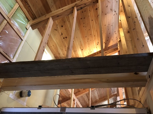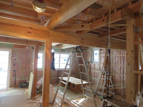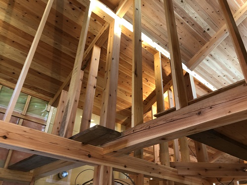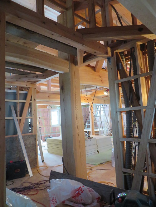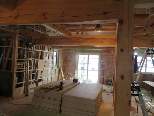 寒い外から中に入ると眼鏡が曇るほどに暖かな室内ですが、目の前に飛び込んで来る大黒柱と太鼓梁の迫力に圧倒されます。完成が楽しみです。