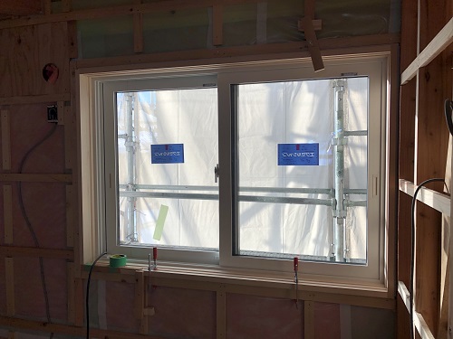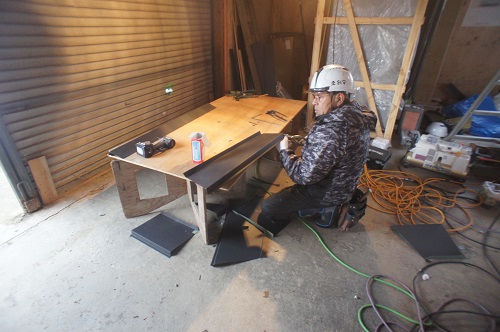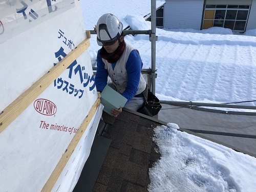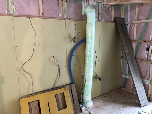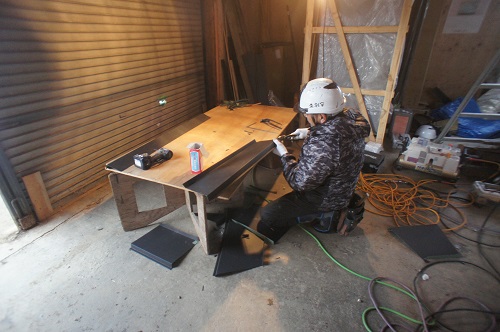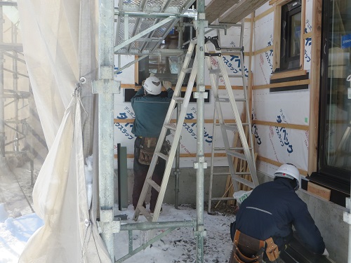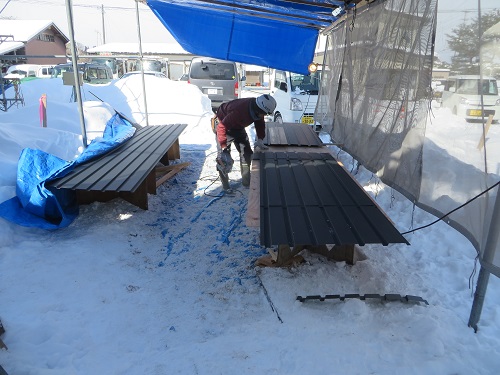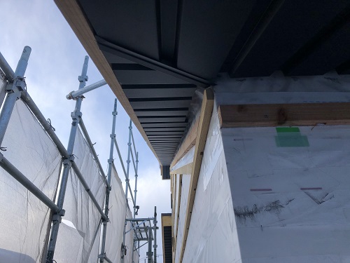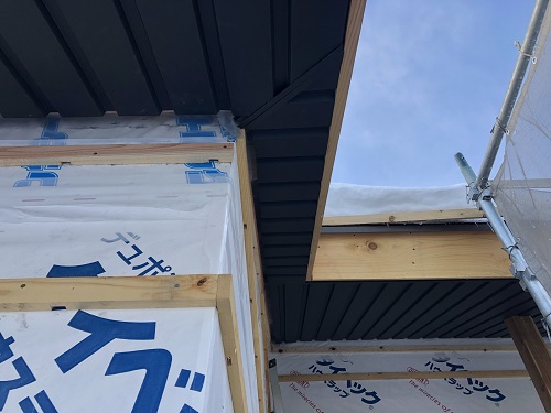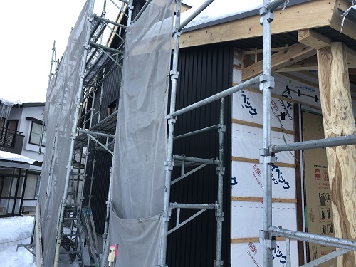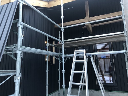 雫石の新築工事は外壁を張り上げて内部工事は下地が大方です。外部工事はコーナー板金や破風板金に雨樋工事が残りますが、それらも今後自社で加工取り付けを行います。