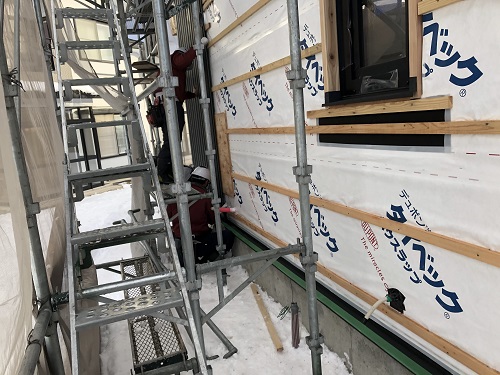 外部のガルバリュウム鋼板張込みと内部各種下地工事が進む新築現場です。